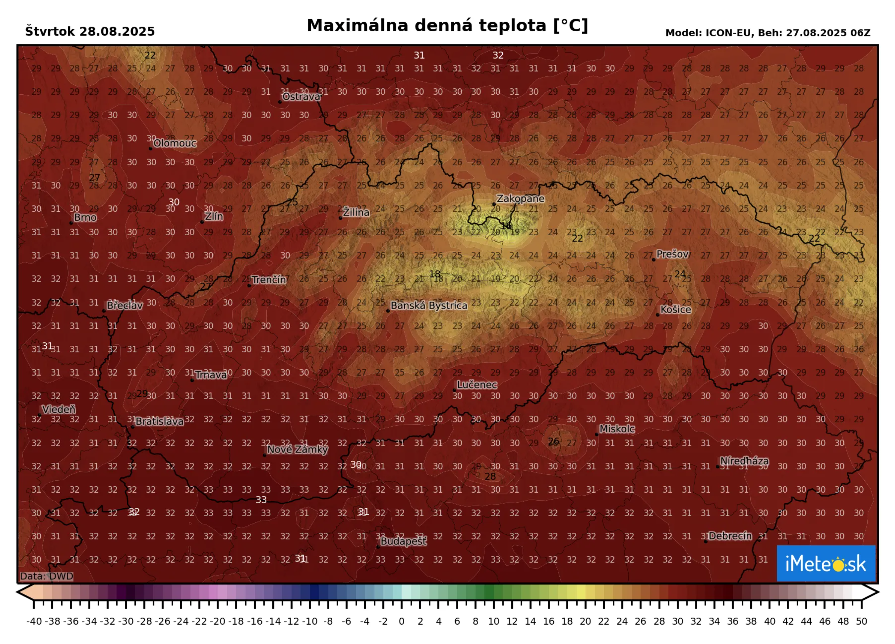 Teploty tak zajtra porastú k +29 °C až +34 °C, na severe miestami okolo +27 °C, na horách vo výške 1 500 m n. m. okolo +18 °C.