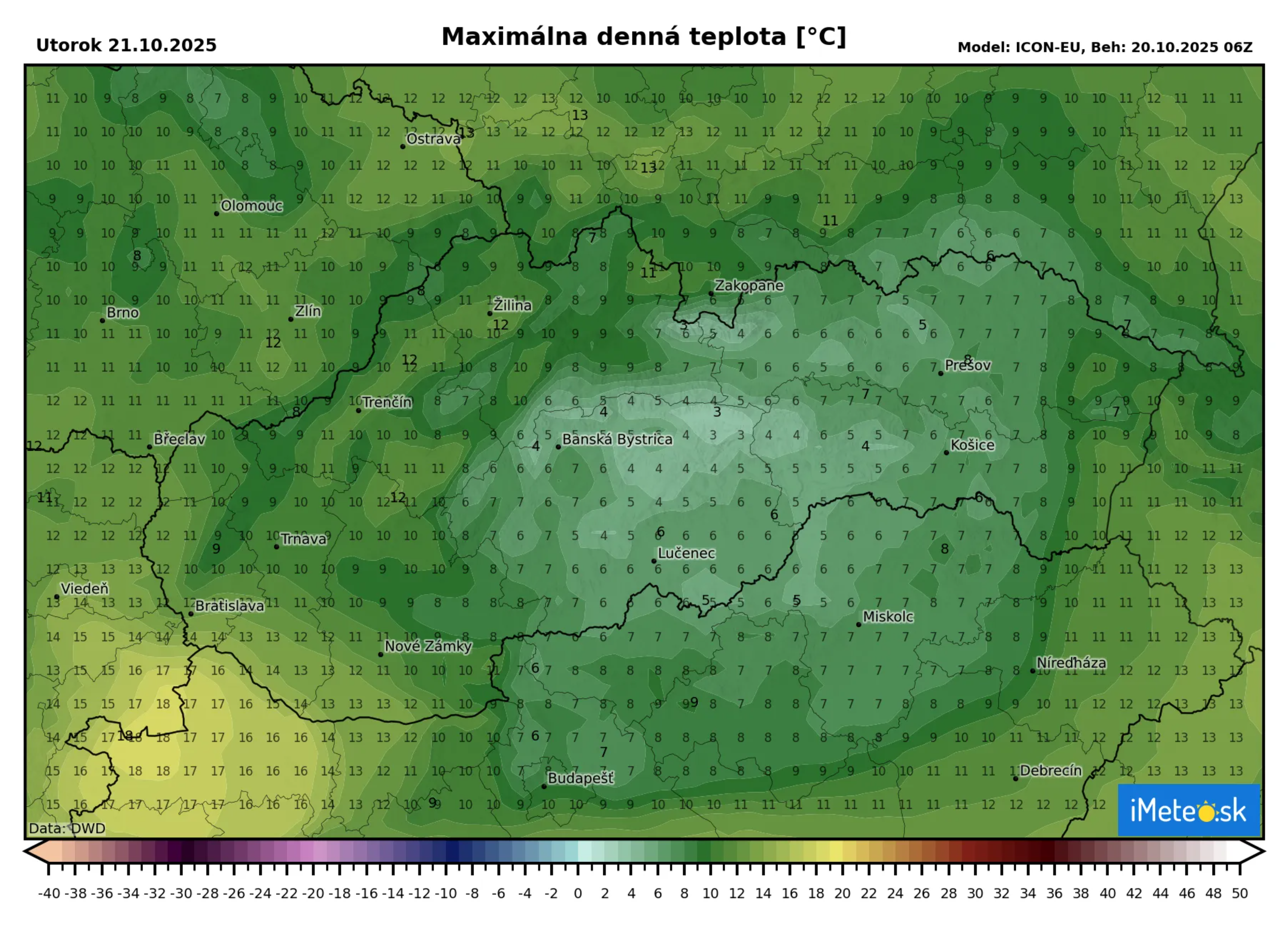 Najvyššie denné teploty budú dosahovať +4 až +14 °C, pričom najchladnejšie bude práve v Banskobystrickom kraji, zatiaľ čo na juhozápade by sa v priebehu dňa mohlo aj vyčasiť a teploty by mohli vystúpiť aj nad +14 °C.