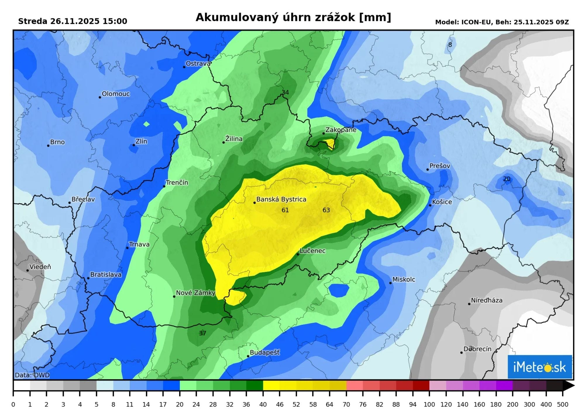 Intenzívny dážď sa očakáva až do zajtrajšieho popoludnia a najviac zrážok spadne v oblastiach, kde v uplynulých hodinách napadlo najviac snehu, teda na strednom Slovensku. Tu sa očakáva, že v podobe dažďa spadne 40 až 60 mm zrážok.
