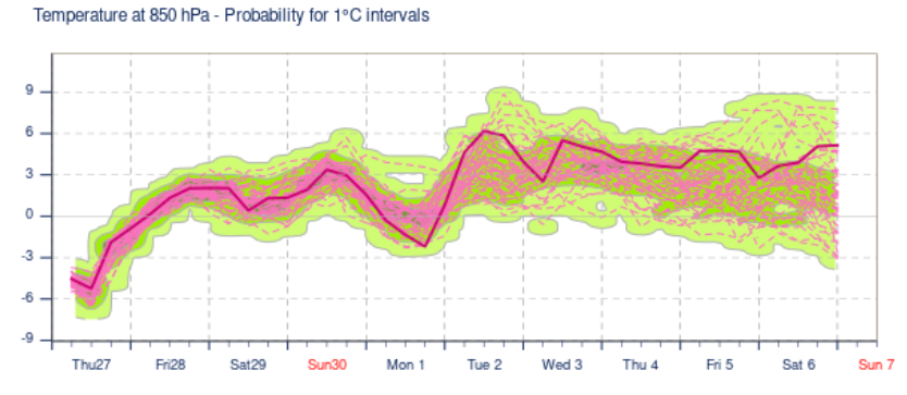 Každopádne sa v našej oblasti očakávajú zrážky, no všimnite si, že rozptyl v očakávanej teplote vzduchovej hmoty je veľký. Nateraz to však vyzerá, že zostaneme v teplejšom vzduchu.