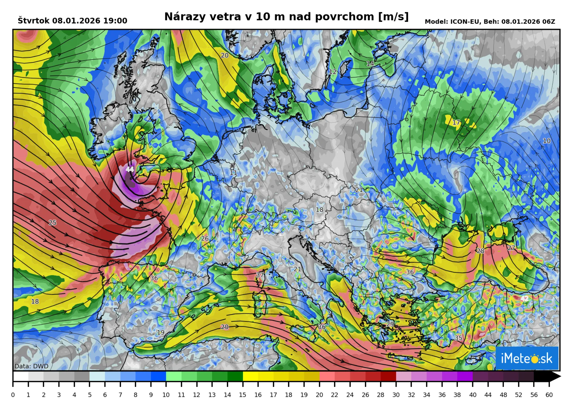 Zajtra ráno sa silný vietor dovalí aj do Francúzska, kde by poryvy vetra mohli presahovať rýchlosť až viac ako 30 m/s.