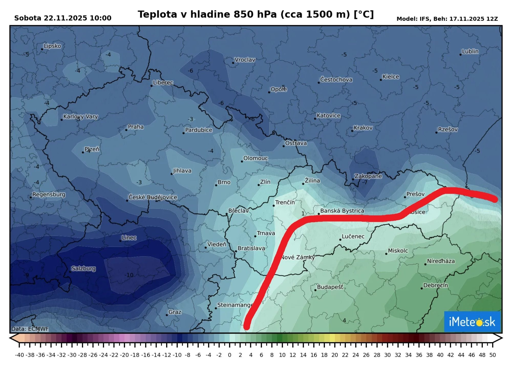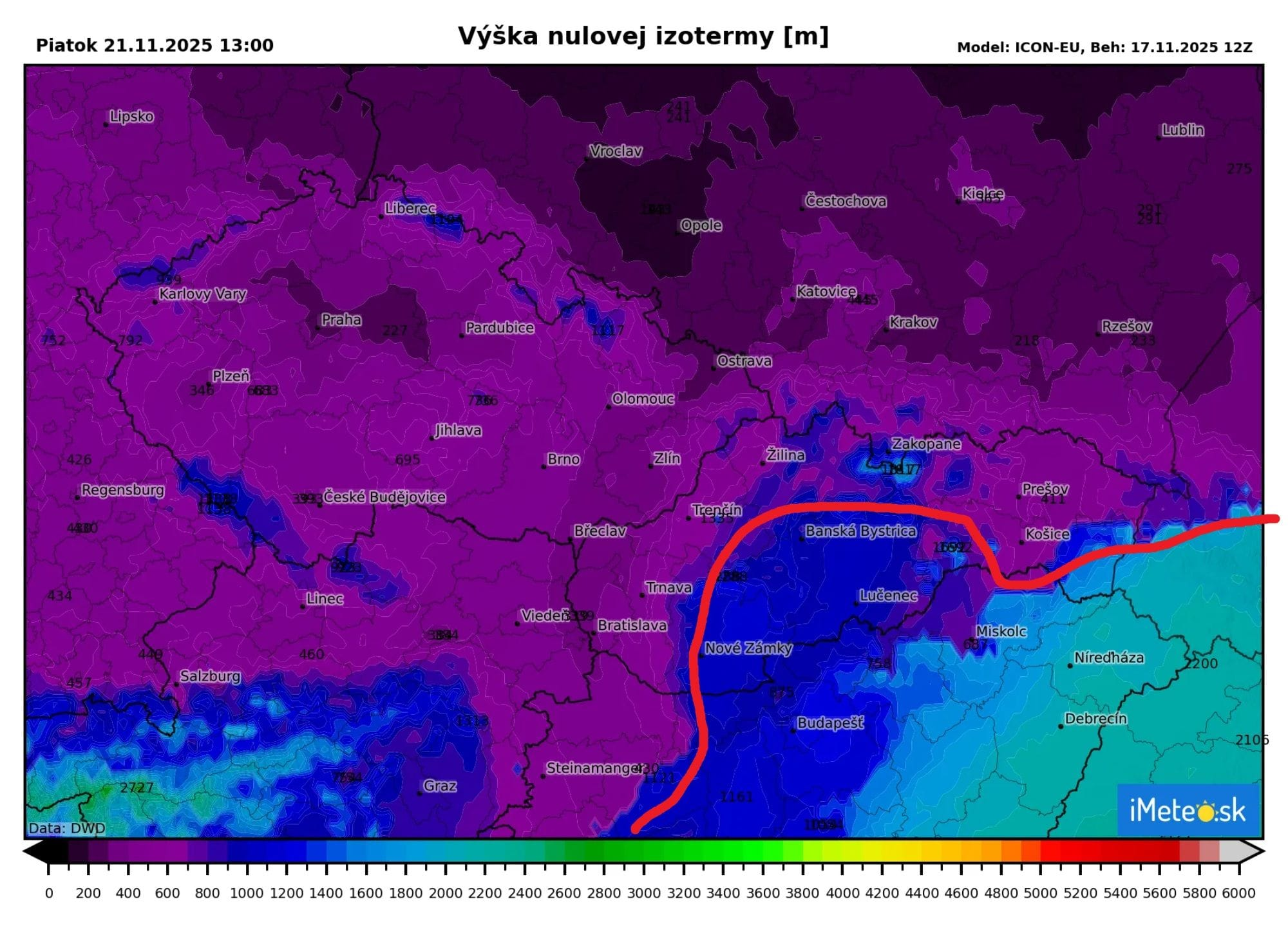 Polohu teplotného rozhrania môžete jasne vidieť aj na očakávanej nulovej izoterme na piatok.