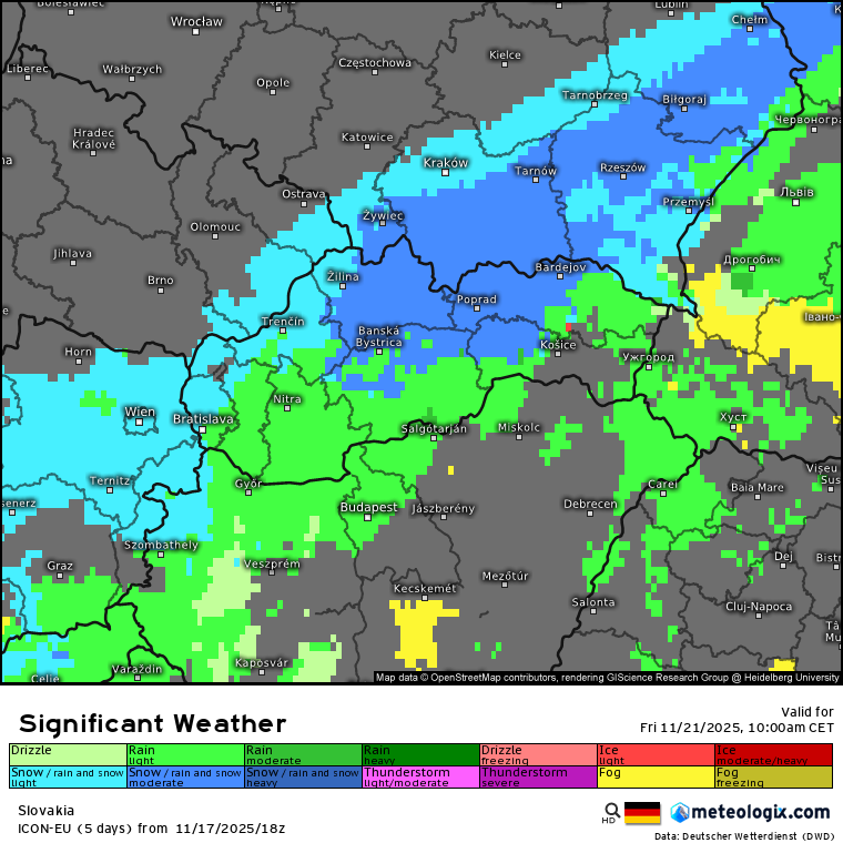 Prekrásne to vidieť na mapke počasia v priebehu piatka. Zelená znázorňuje dážď a modrá sneženie. Všimnite si, že snežiť môže nielen na severe, ale aj na západe, či dokonca v Bratislave.