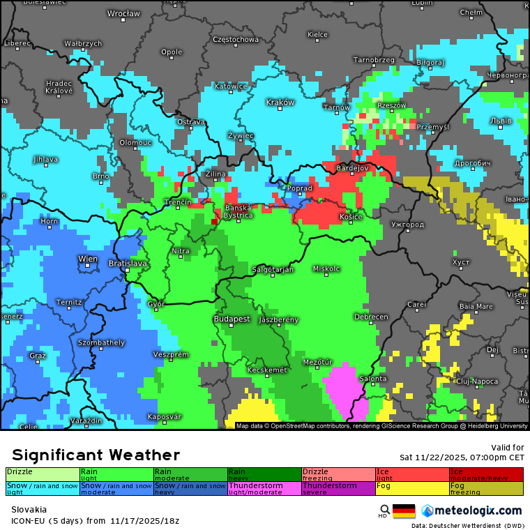 Najvýdatnejšie zrážky by mali prísť v sobotu večer. Aktuálna predpoveď tak sľubuje výdatné sneženie v okolí Viedne, Záhoria, či dokonca v Bratislave. V Podunajskej nížine by však malo už pršať a rovnako tak na väčšine Slovenska. Na severe východného Slovenska hrozia aj mrznúce zrážky.