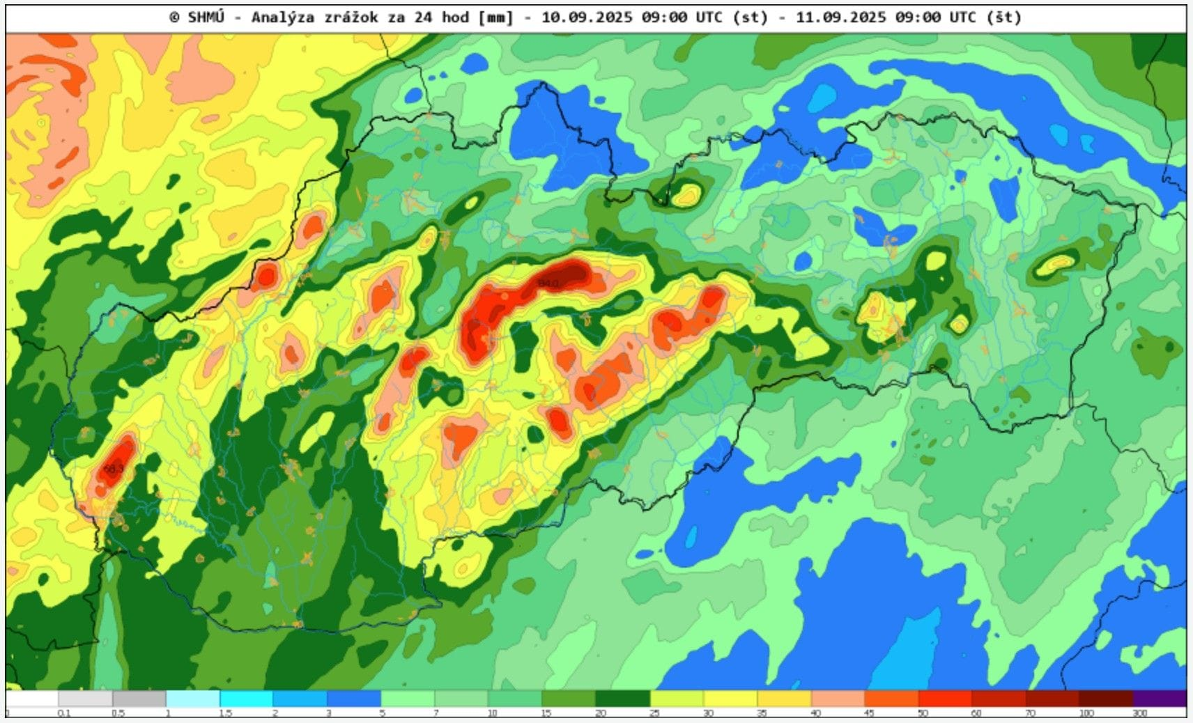 Najviac zrážok by aj v tomto prípade mali obdržať južné návetria hôr, kde by, podobne ako včera, mohlo spadnúť až okolo 50 mm zrážok. Výdatne však zaprší na celom území.