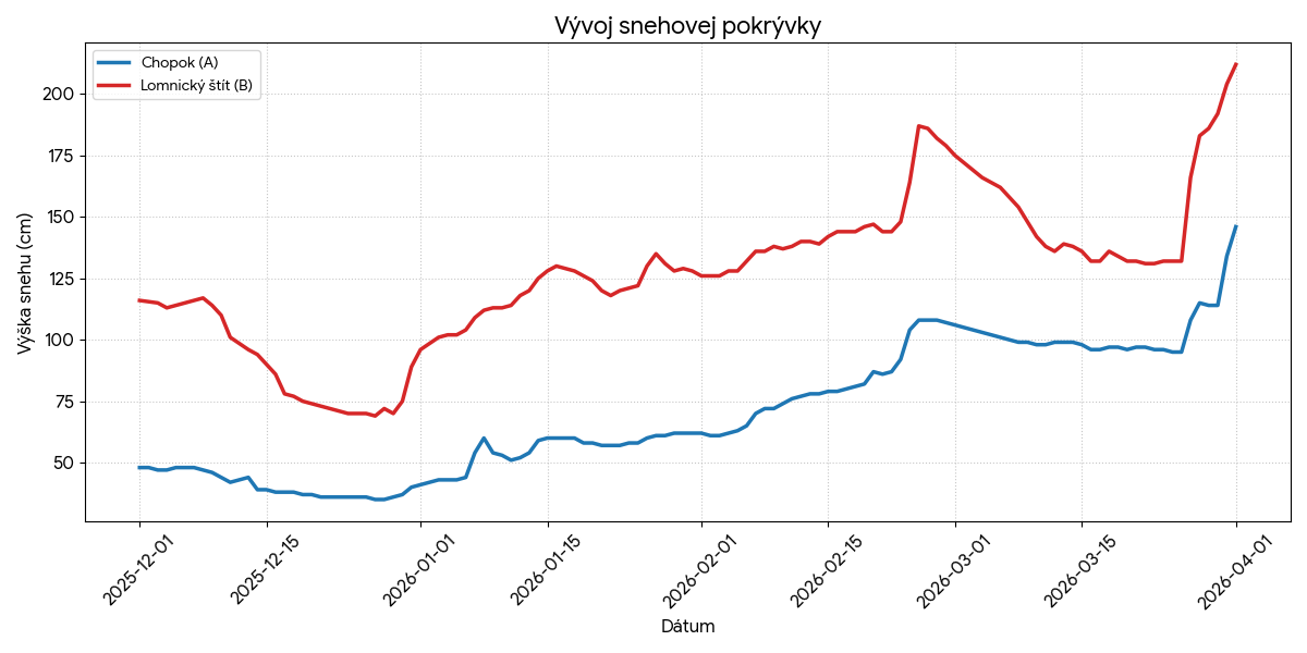 Ešte výraznejší vývoj zaznamenal Lomnický štít. Ten sa takmer celú zimu držal nad hranicou 100 cm, pričom výrazný nárast prišiel už v druhej polovici februára, keď výška snehu vzrástla až na 187 cm.