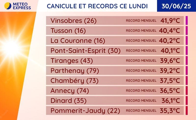 Pondelok 30. júna sa zapísal do histórie ako najteplejší júnový deň vo Francúzsku od začiatku meraní v roku 1947. Doterajší rekord z 27. júna 2019 bol prekonaný.