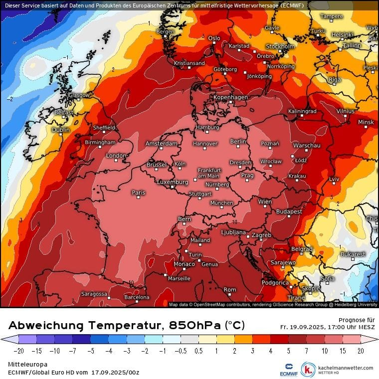 Nezvyčajné na tejto situácii bude to, že príliv teplého vzduchu bude extrémne intenzívny. Takéto prúdenie nie je na druhú polovicu septembra bežné. Naznačuje to aj mapa teplotných anomálii v hladine 850 hPa.