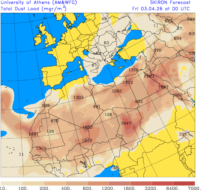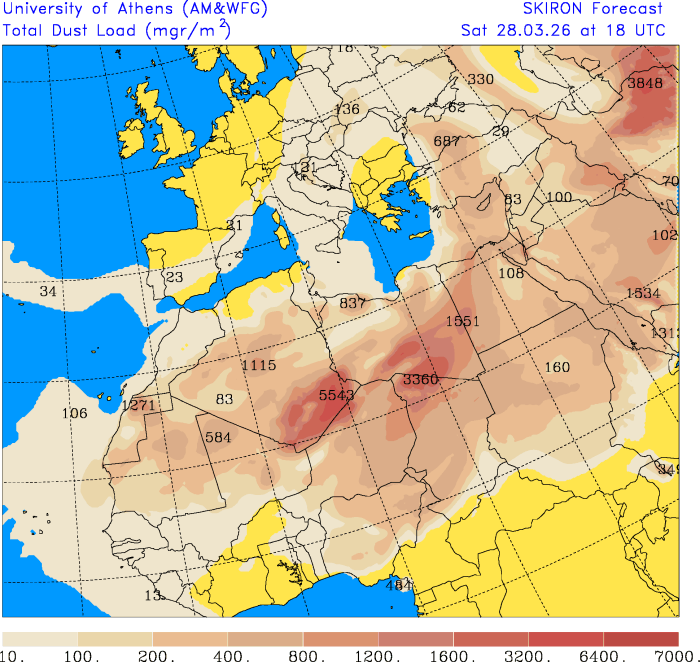 Podľa prognóz predpovedného modelu SKIRON sa bude prach nad naším územím vyskytovať minimálne do piatku, nedosiahne sa však vysoké hodnoty.