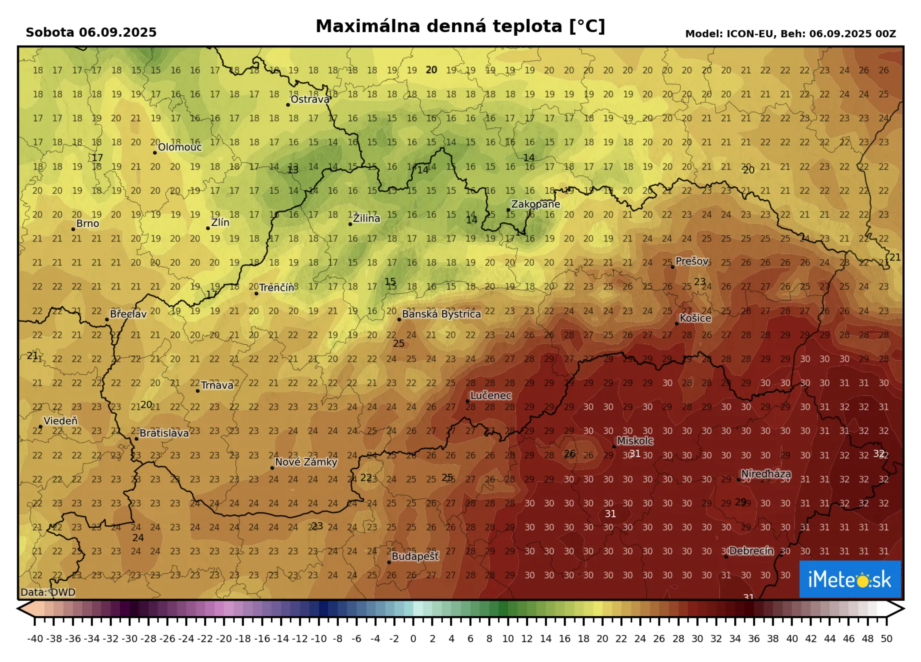 Aj dnes k nám od juhozápadu prúdi ešte teplejší vzduch a maximálne teploty sa vyšplhajú k +26 °C až +32 °C, avšak najmä na juhovýchode Slovenska.