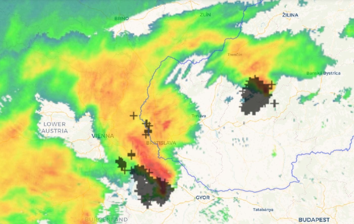 Práve južne od Bratislavy sa sformovala aj línia, ktorá môže okrem prívalového dažďa priniesť aj krúpy a silný vietor, ale aj zaujímavé oblačné štruktúry.