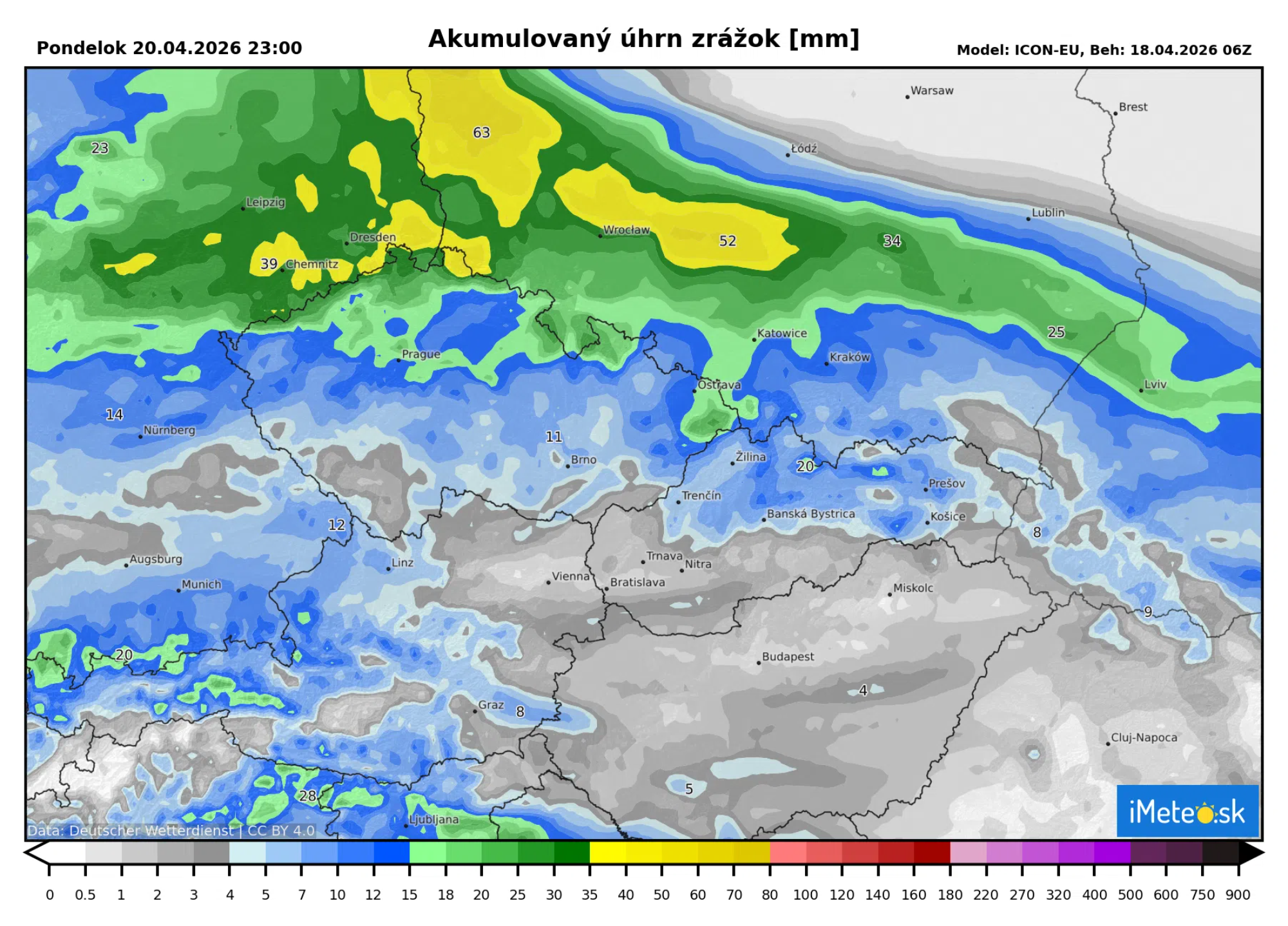 Ako vidieť na mape, tak najvýraznejšie zrážky by sa mali vyskytovať u našich severných susedov, kde by mohlo spadnúť aj niekoľko desiatok milimetrov zrážok.