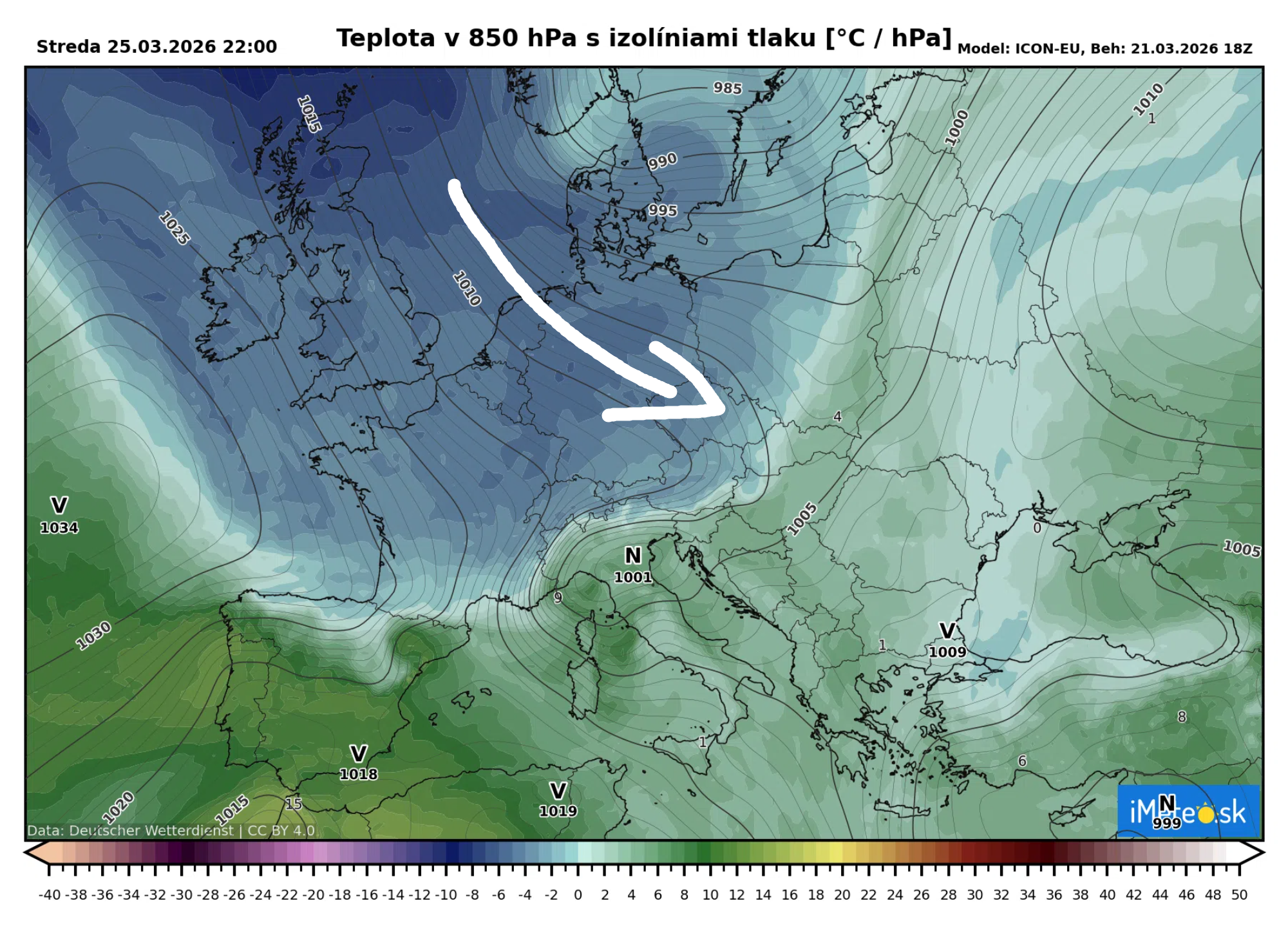 Už v stredu večer by sa malo počasie na našom území začať meniť. Súvisieť to bude s tým, že chladný vzduch sa bude cez Európu prelievať smerom nad Slovensko a ako vidieť na mape, v stredu večer ho budeme mať doslova pred bránami Slovenska.