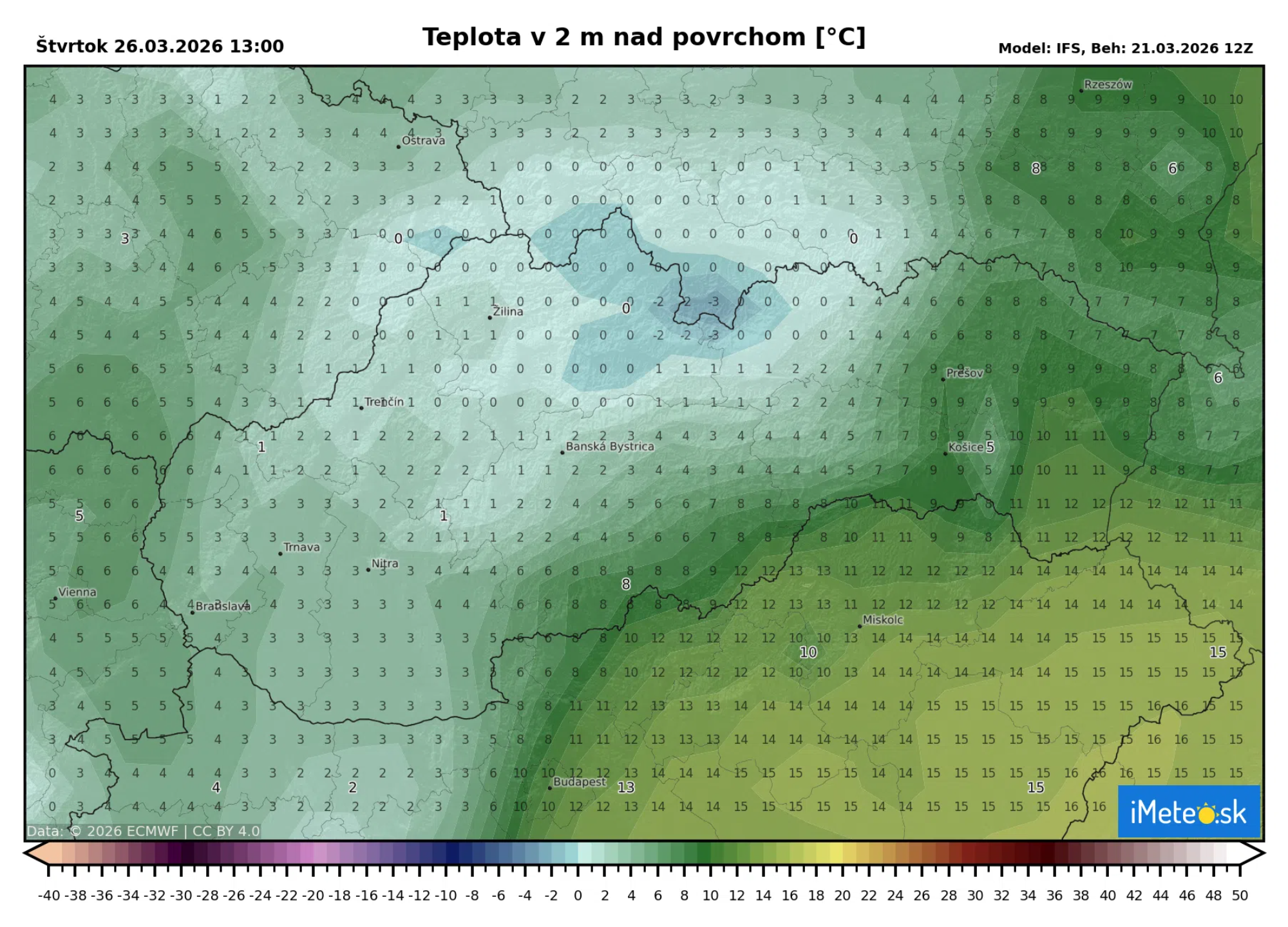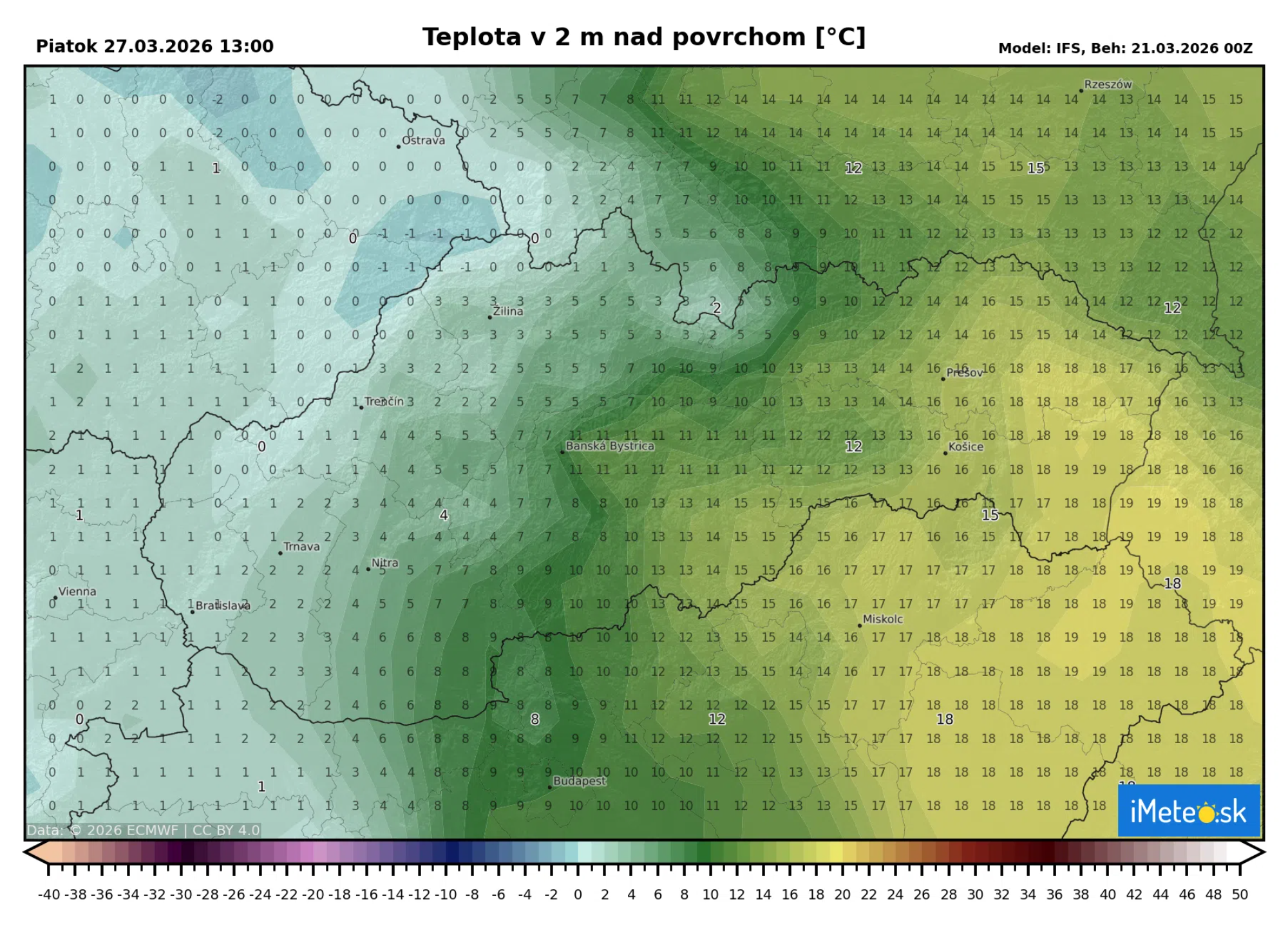 Krásne to môžeme vidieť na očakávaných teplotách v piatok popoludní podľa včerajšieho výstupu modelu ECMWF. Tento výstup je doslova extrémny. Očakáva totiž, že na východe sa budú teploty pohybovať od +15 až do neuveriteľných +20 °C, zatiaľ čo na západe bude len od +1 do +3 °C.