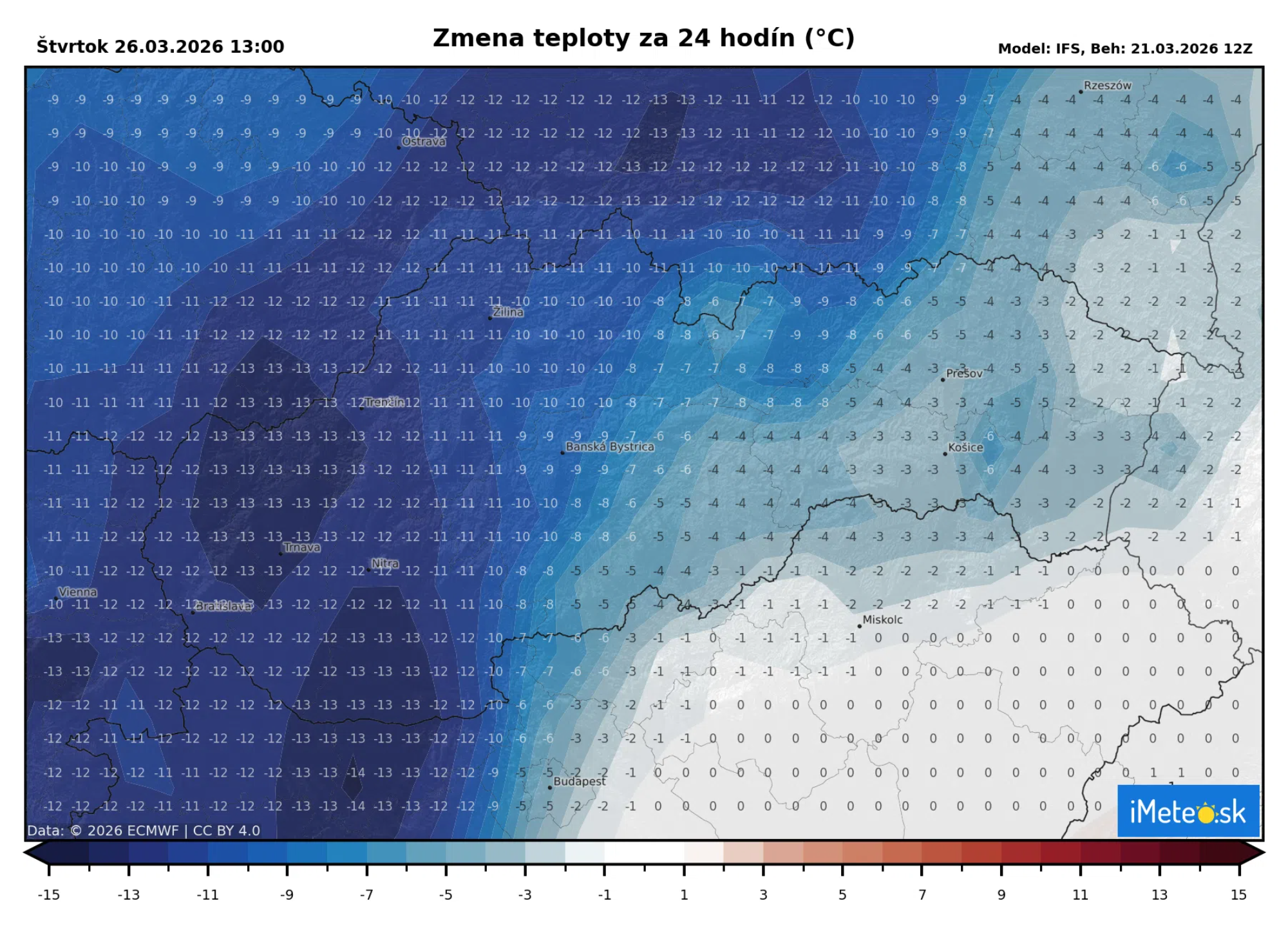 Štvrtok by mal byť v porovnaní so stredou až o 12 °C chladnejší, čo pekne vidieť na mape, ktorá porovnáva štvrtkové teploty so stredajšími.