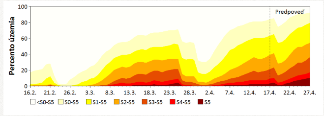 Ako vidieť na grafe očakávaného vývoja sucha, tak v nadchádzajúci týždeň sa bude situácia so suchom na Slovensku čoraz viac zhoršovať a ku koncu apríla sa očakáva extrémne sucho až veľmi veľké sucho na viac ako 20 % územia Slovenska.