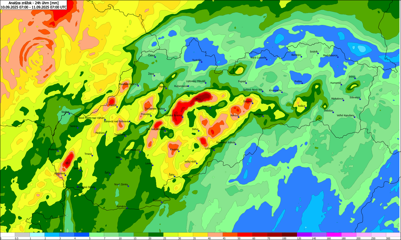 Úhrny zrážok namerané do štvrtka 11. septembra 2025, 09:00 h, potvrdzujú upršaný charakter dažďa. Najviac spadlo na stanici Demänovská dolina – Jasná, kde sa zaznamenalo až 82,5 mm. O niečo menej, no stále mimoriadne výdatných 75,6 mm, hlási Partizánska Ľupča – Magurka.