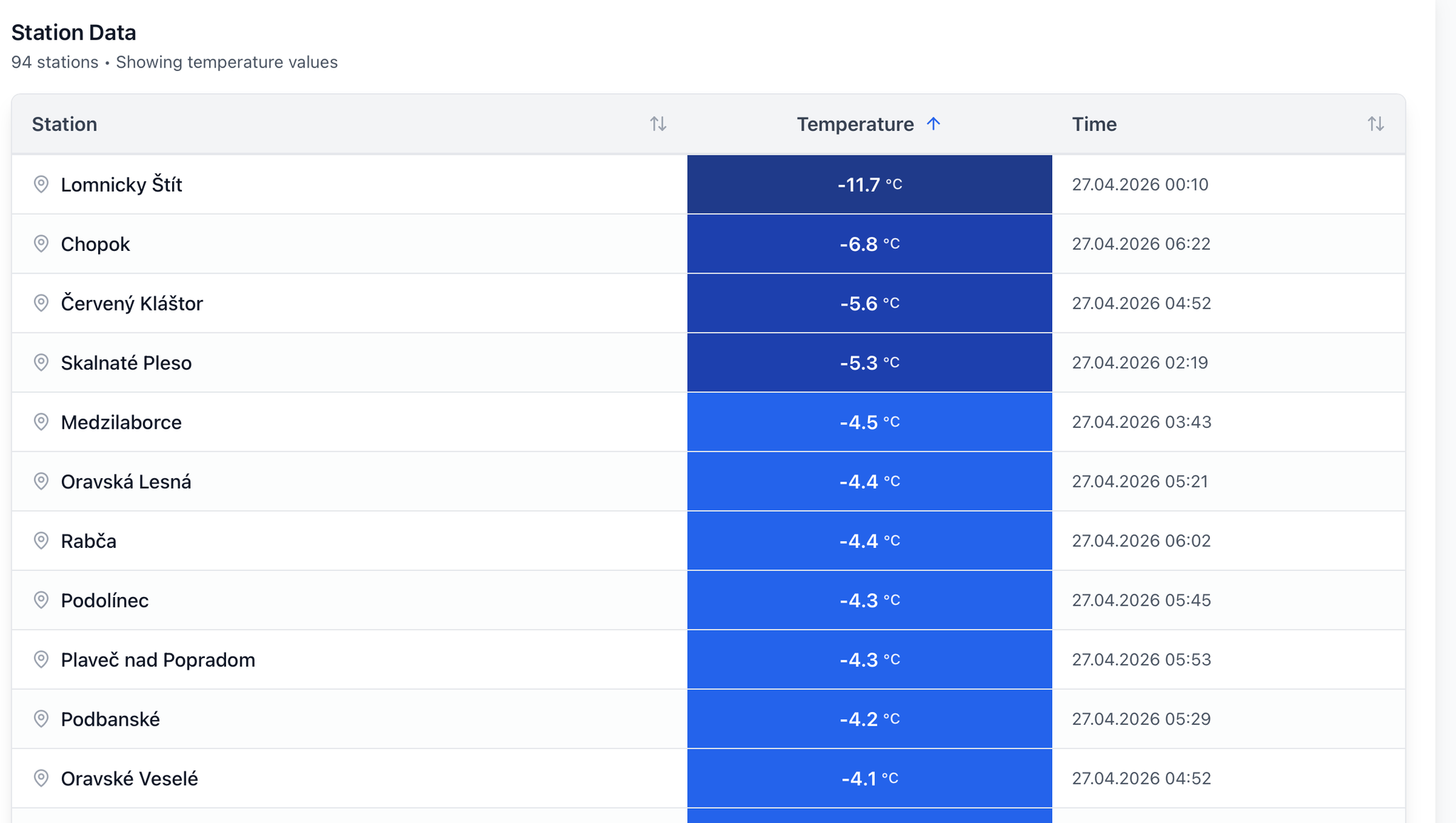 Najchladnejšie bolo tradične v oblastiach Oravy, Liptova, na Horehroní a v okolí Popradu, kde sa ortuť teplomera miestami priblížila až k hranici -5 °C. V Červenom Kláštore klesla teplota na -5,3 °C, na Skalnatom Plese -5,3 °C, v Rabči bolo -4,4 °C a napríklad na východe v Medzilaborciach klesli teploty na -4,5 °C.