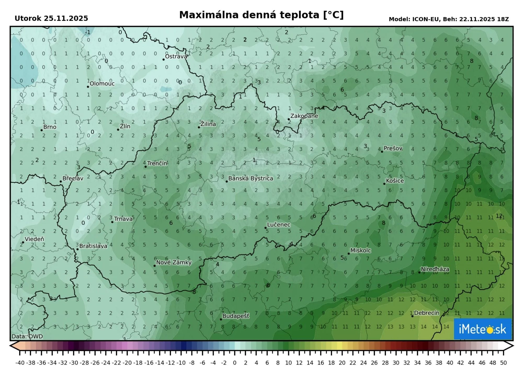 V utorok to vyzerá na pomerne zaujímavú situáciu. Nad našim územím sa bude nachádzať teplotné rozhranie a síce sa na väčšine Slovenska ochladí, tak od severozápadu sa nad krajný západ a severozápad dostane studený vzduch. Tu by tak malo byť najchladnejšie, ale na zvyšku územia sa teploty dostanú až na +6 °C, na východe až na +10 °C.