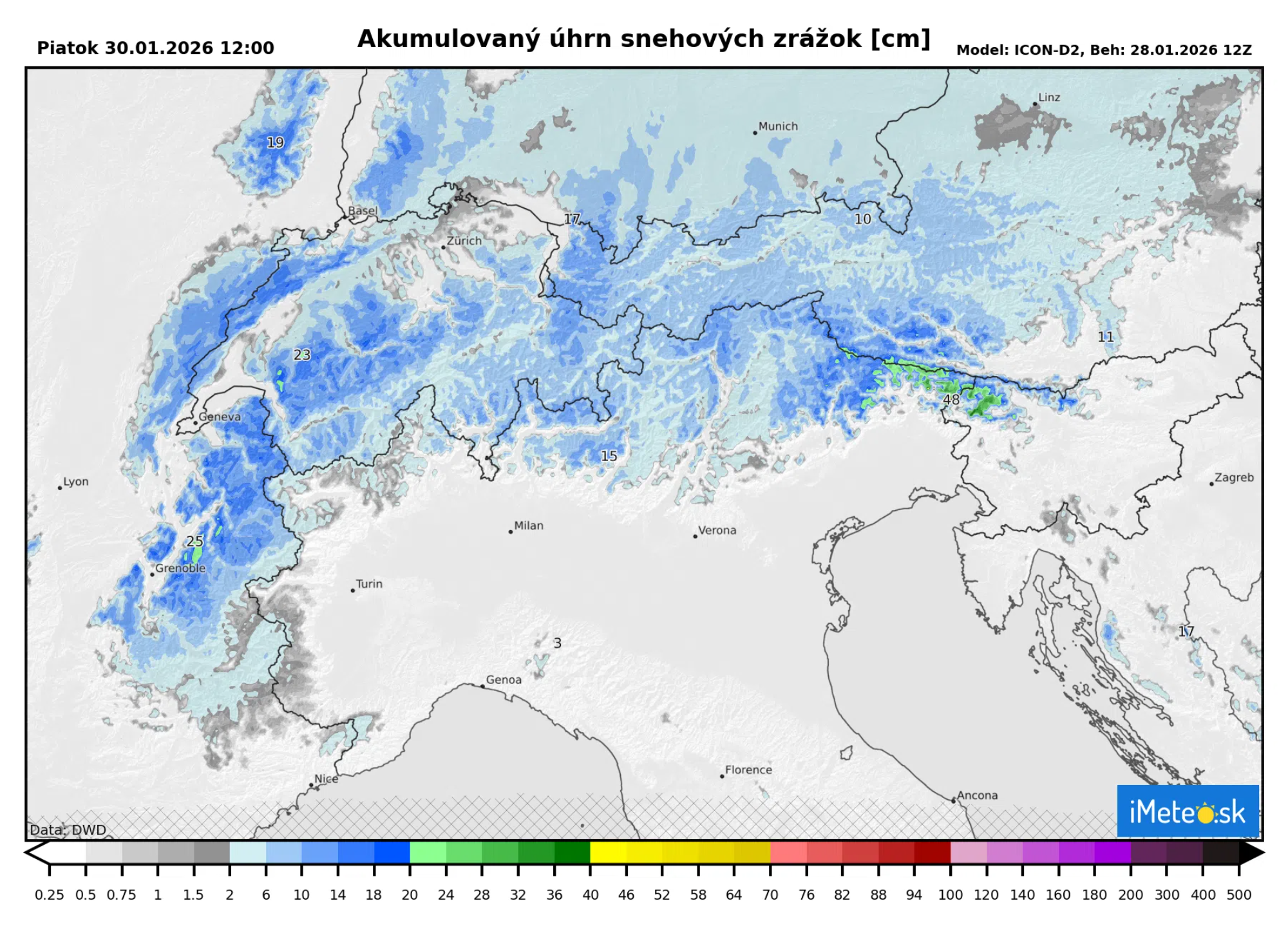 Dážď sa bude postupne meniť na sneženie vo všetkých oblastiach nad 400 metrov nad morom. Na severe počas štvrtka poklesne hranica sneženia aj do nižších polôh. Najrýchlejšie prenikne chladný vzduch nad územie Českej republiky, Nemecka a Rakúska, kde bude počas celého štvrtka výdatne snežiť.