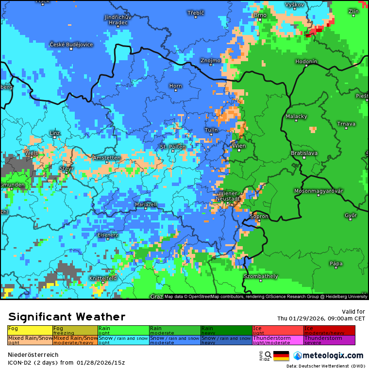 Na krajnom východe Rakúska, ako aj na Slovensku, sa však bude ešte udržiavať teplejší vzduch, čo je viditeľné aj na mape charakteru počasia. Modrou farbou je znázornené sneženie a zelenou farbou dážď.