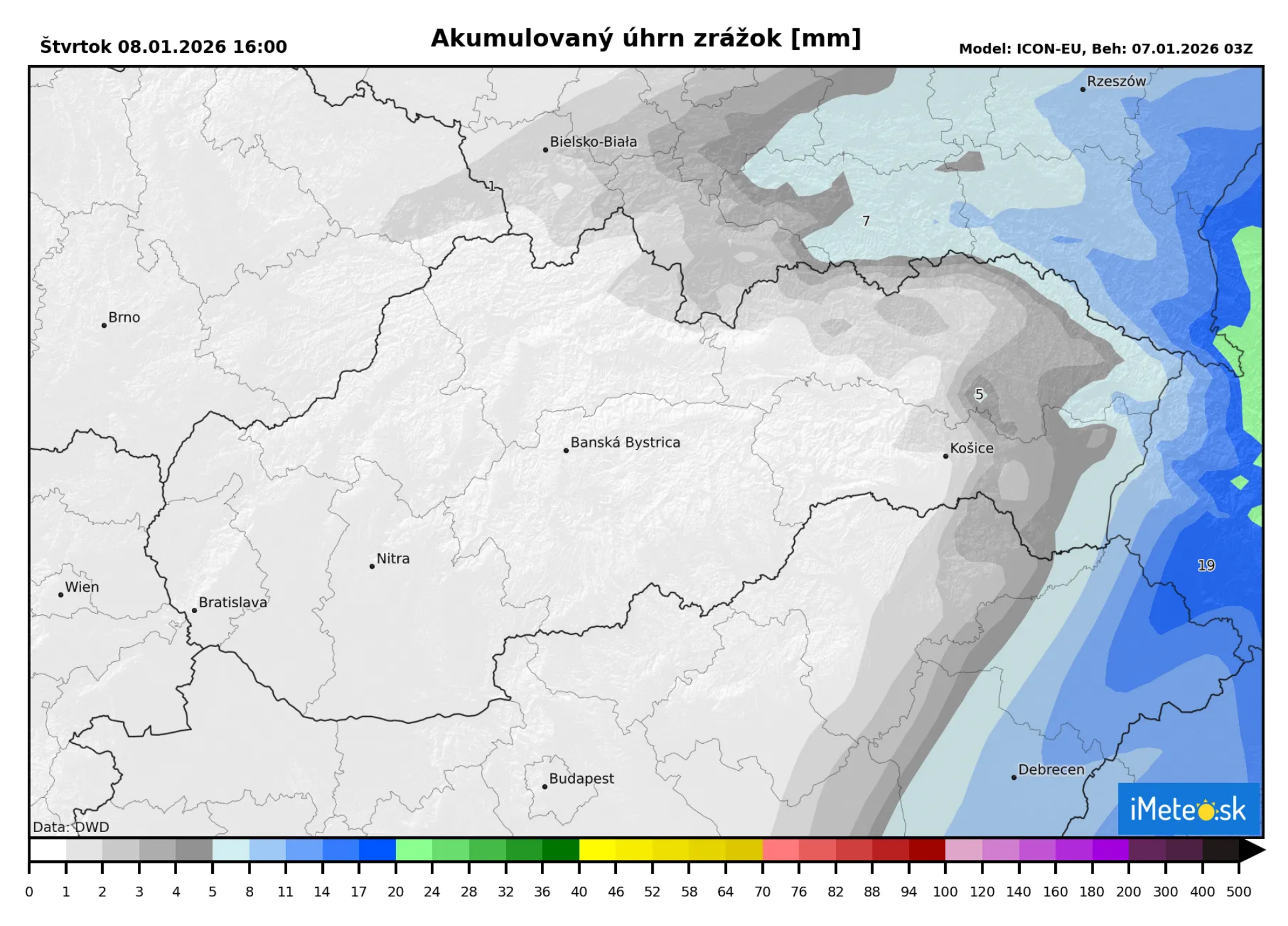 V nočných hodinách by malo sneženie zasiahnuť predovšetkým východné Slovensko, kde napadne ďalších 1 až 5 cm nového snehu. Na krajnom východe môže miestami napadnúť aj viac ako 5 cm.