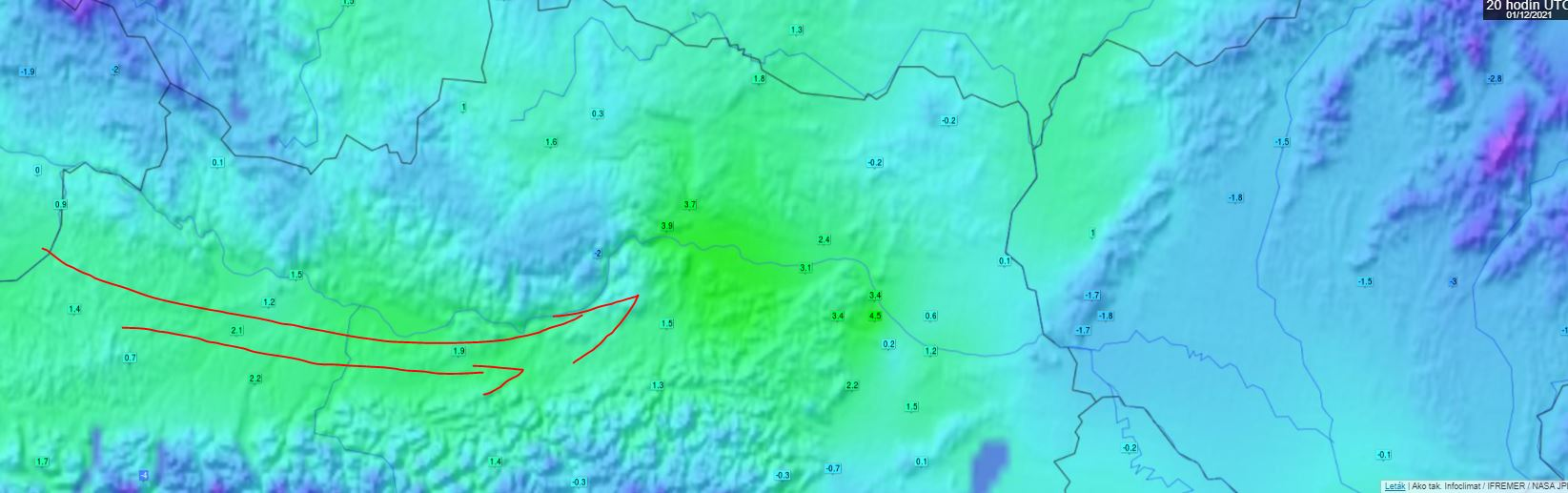 Tento vzduch zatiekol aj nad naše územie, konkrétne nad Záhorie, kde teplota stúpa k +1 °C. Ďalej sa však teplý vzduch nedostane.