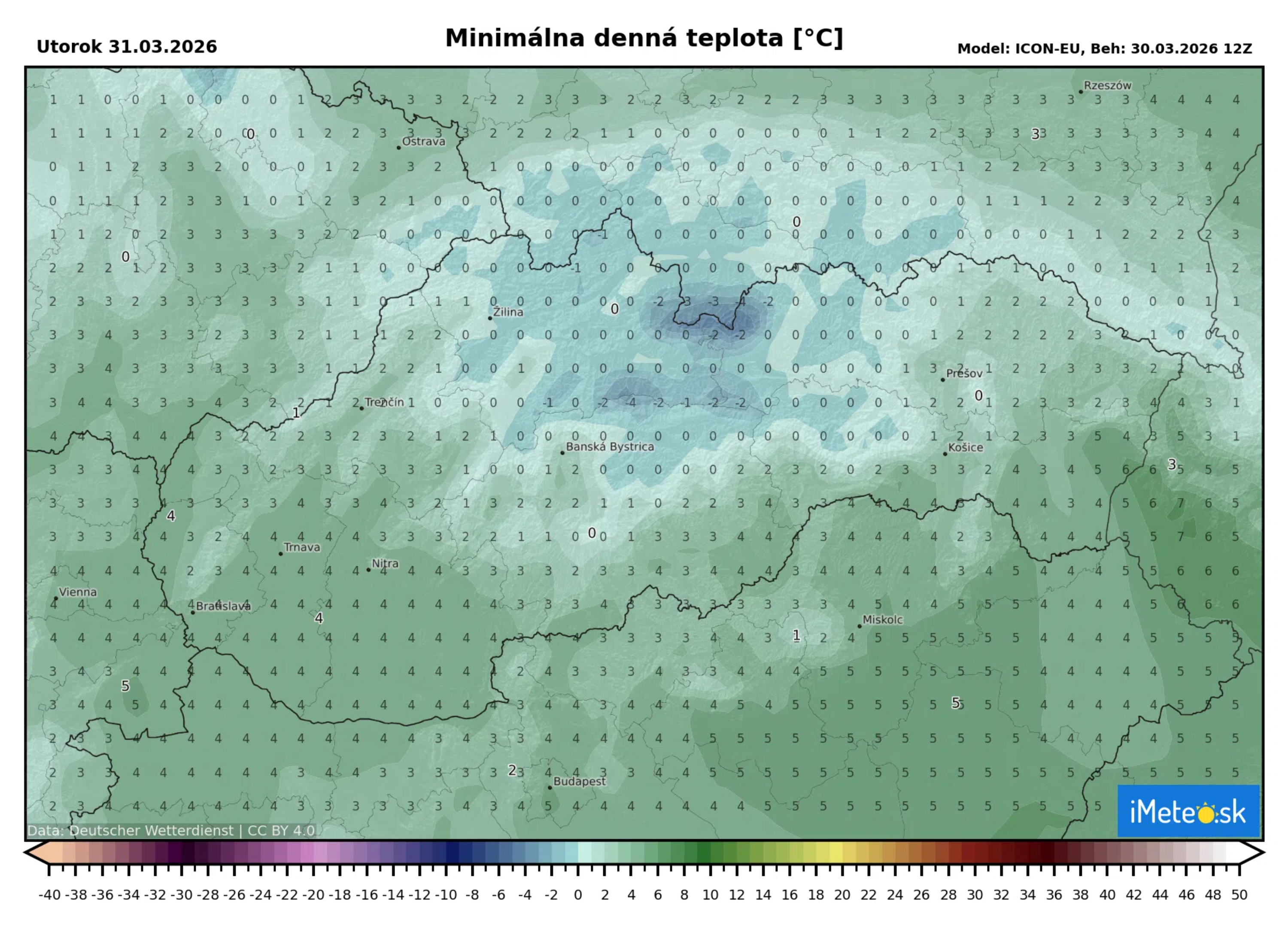 Najnižšia nočná teplota sa bude pohybovať v rozmedzí od +6 do +1 °C, pričom v Žilinskom kraji a na Spiši môže lokálne klesnúť až na približne -1 °C. Práve v oblastiach s teplotami okolo bodu mrazu bude najvyššie riziko tvorby poľadovice a zamŕzania mokrých vozoviek, čo môže výrazne zvýšiť riziko dopravných nehôd.
