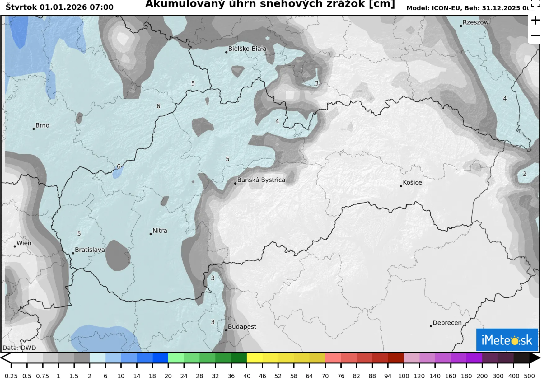 Ako vidieť na aktuálnej mape očakávaných snehových zrážok, tak najviac zrážok by malo spadnúť do zajtrajšieho poludnia na celom západnom a severozápadnom Slovensku, kde napadne do 5 cm snehu.