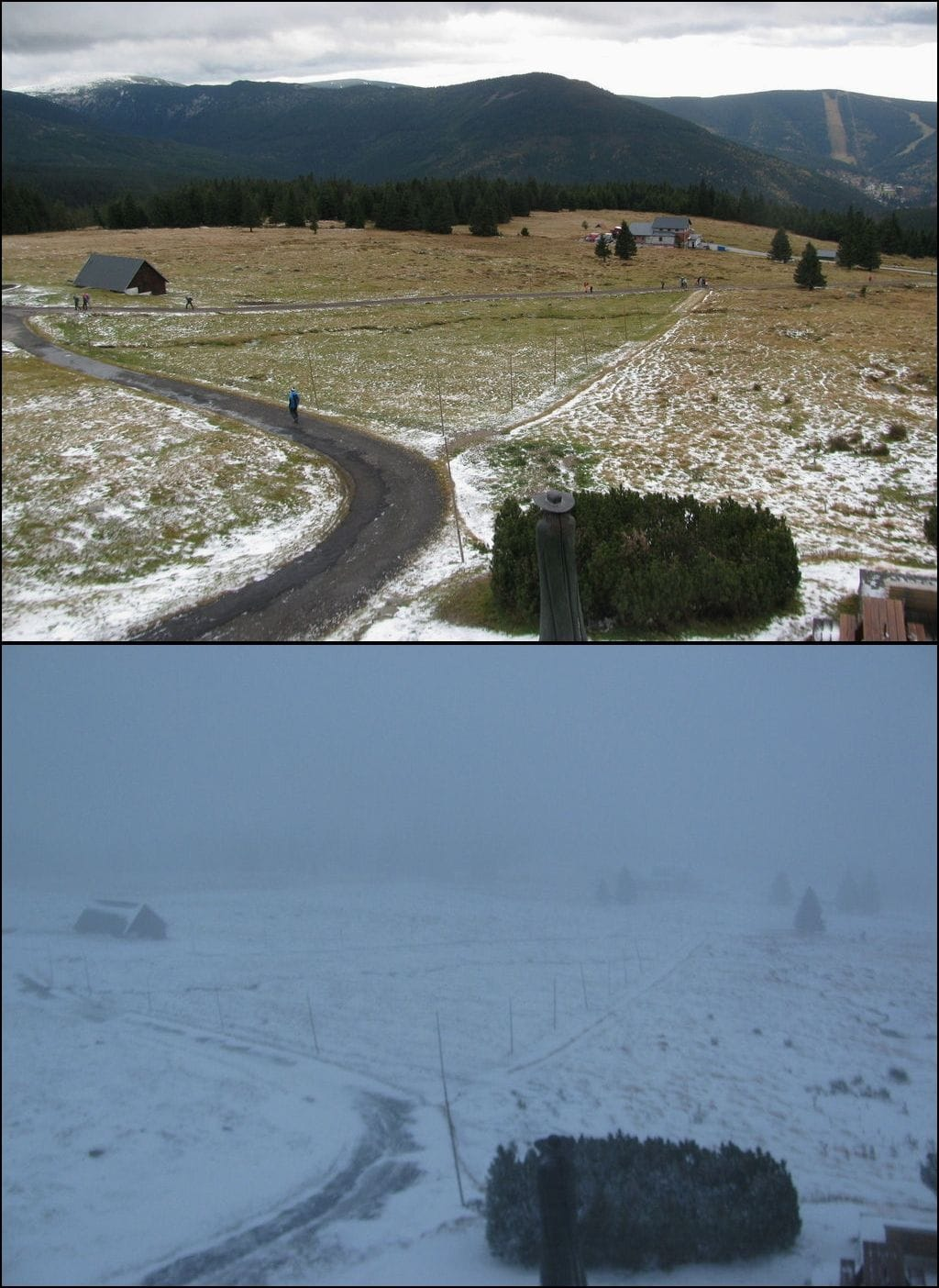 V priebehu včerajšieho popoludnia sa sneženie dostalo aj do Česka. Sneh zasypal predovšetkým severné časti Česka a najviac centimetrov obdržali Krkonoše. Nižšie priložená fotka zachytáva situáciu dopoludnia a počas nedeľňajšieho popoludnia.