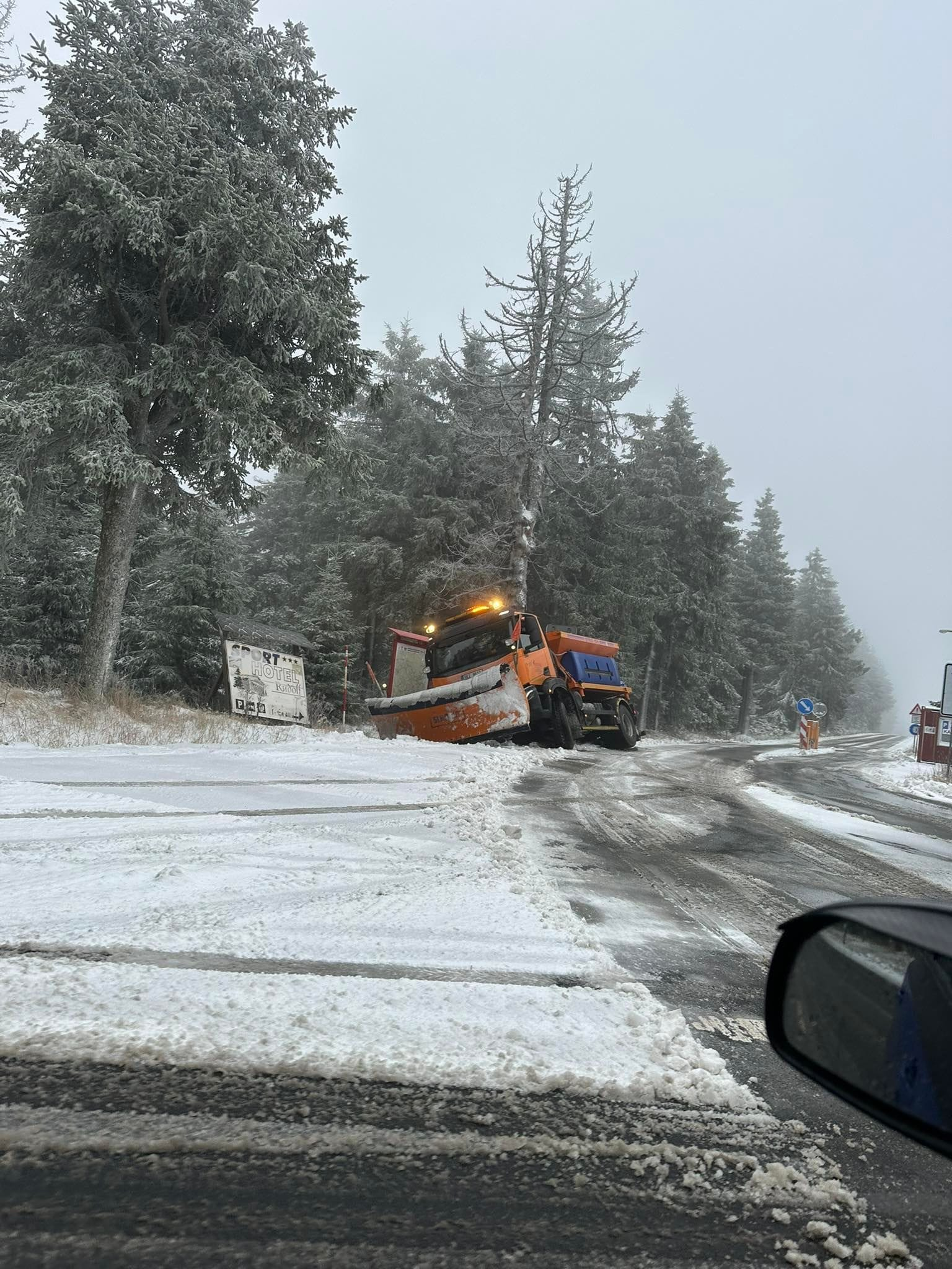 Sneženie sa však vrátilo aj do Krušných hôr, kde skončilo niekoľko áut mimo vozovku a na šmykľavú cestu doplatili aj cestári.