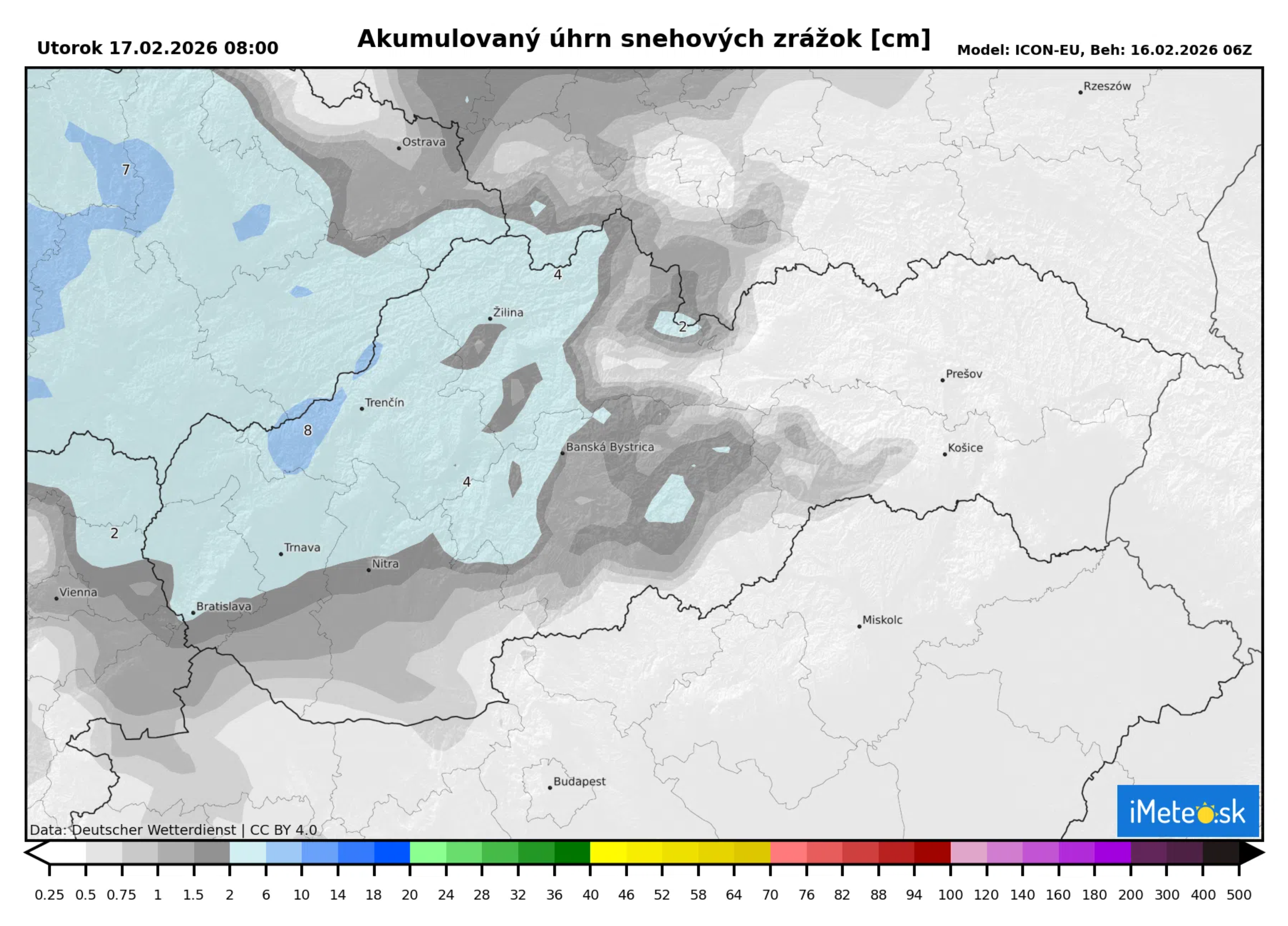Do rána by mohlo na západnom Slovensku a strednom Slovensku napadnúť väčšinou 1 až 4 cm snehu. Viac ho pribudne smerom na severozápad, kde môže napadnúť 3 až 8 cm snehu.