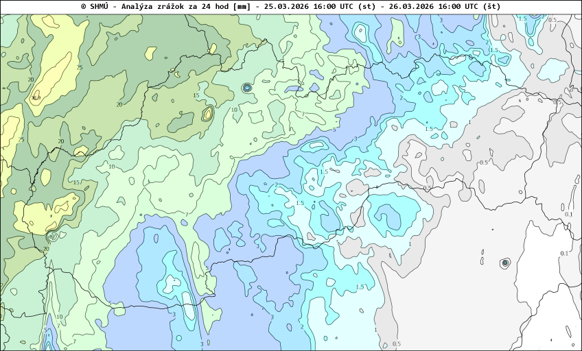 Zrážkové pole je najaktívnejšie v severozápadnej časti Slovenska, kde lokálne spadlo už viac ako 20 mm zrážok. Najviac ich doposiaľ evidujeme v oblasti Malých Karpát: