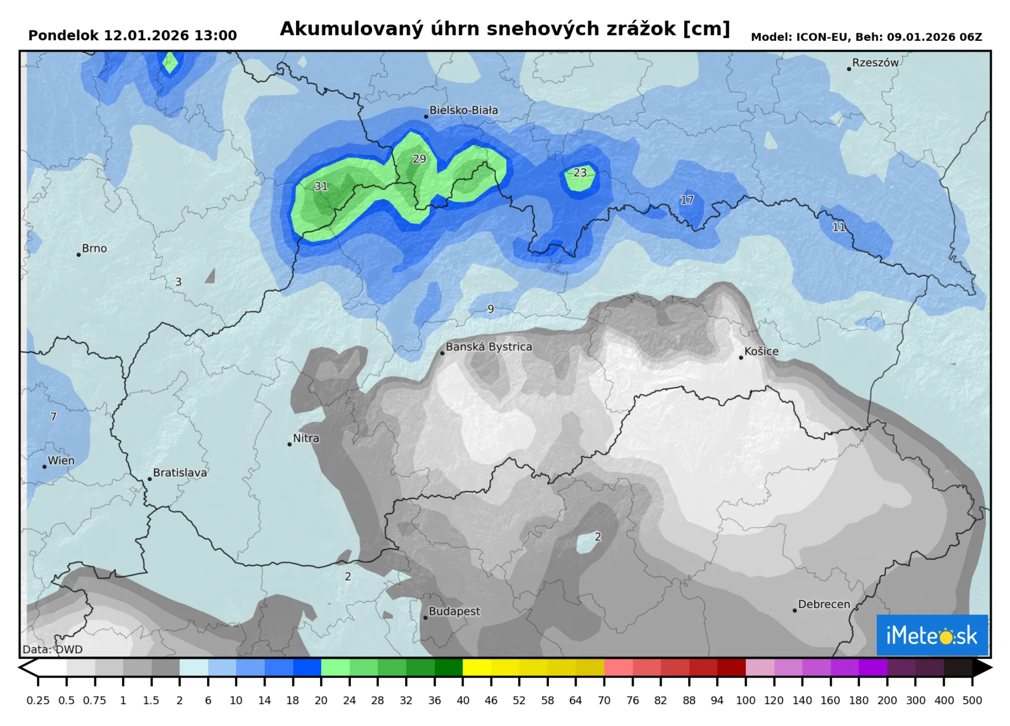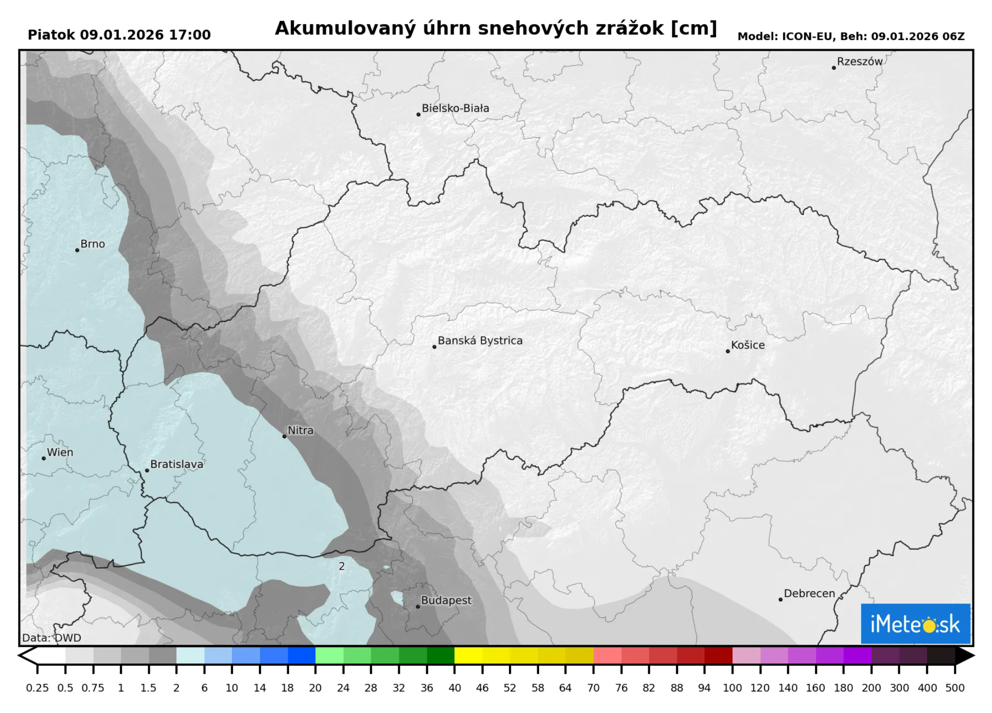 Sneženie by po 14.00 malo od západu na našom území pomerne rýchlo ustávať a so západom Slnka ustane už sneženie na celom území. Dovtedy ešte pribudne na západe nejaký ten centimeter snehu. Očakáva sa, že celkovo napadne do 3 cm.