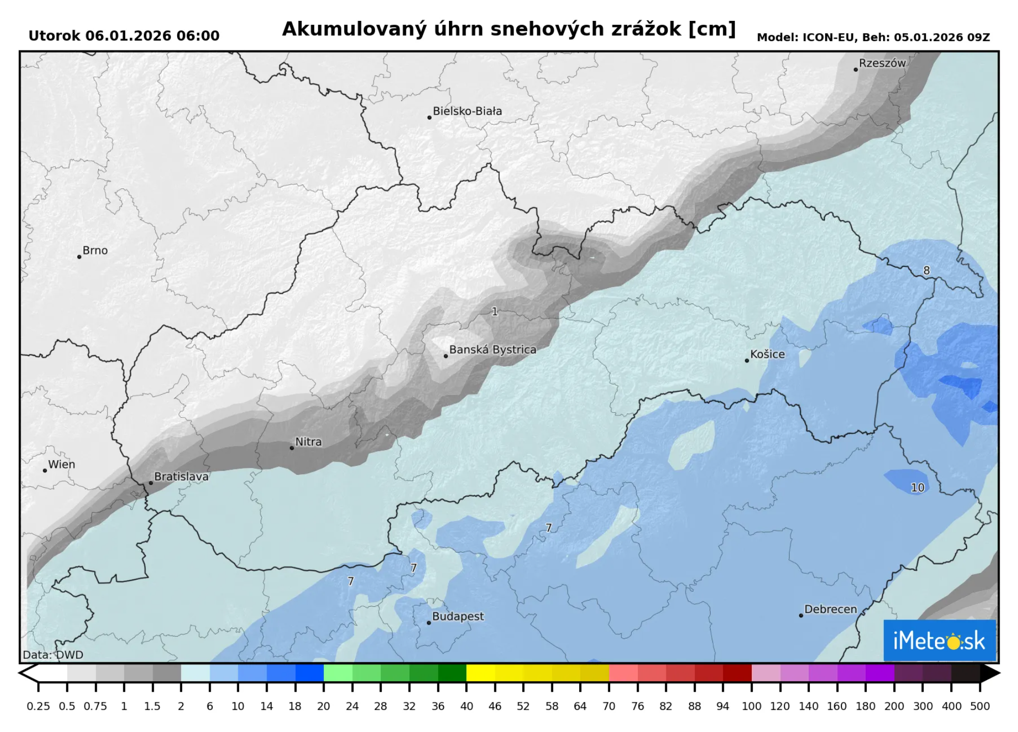 Podľa aktuálnej predpovede by na juhu a východe malo do rána spadnúť od 1 do 5 cm. Na krajnom juhovýchode a východe však napadne až do 10 cm čerstvého snehu.