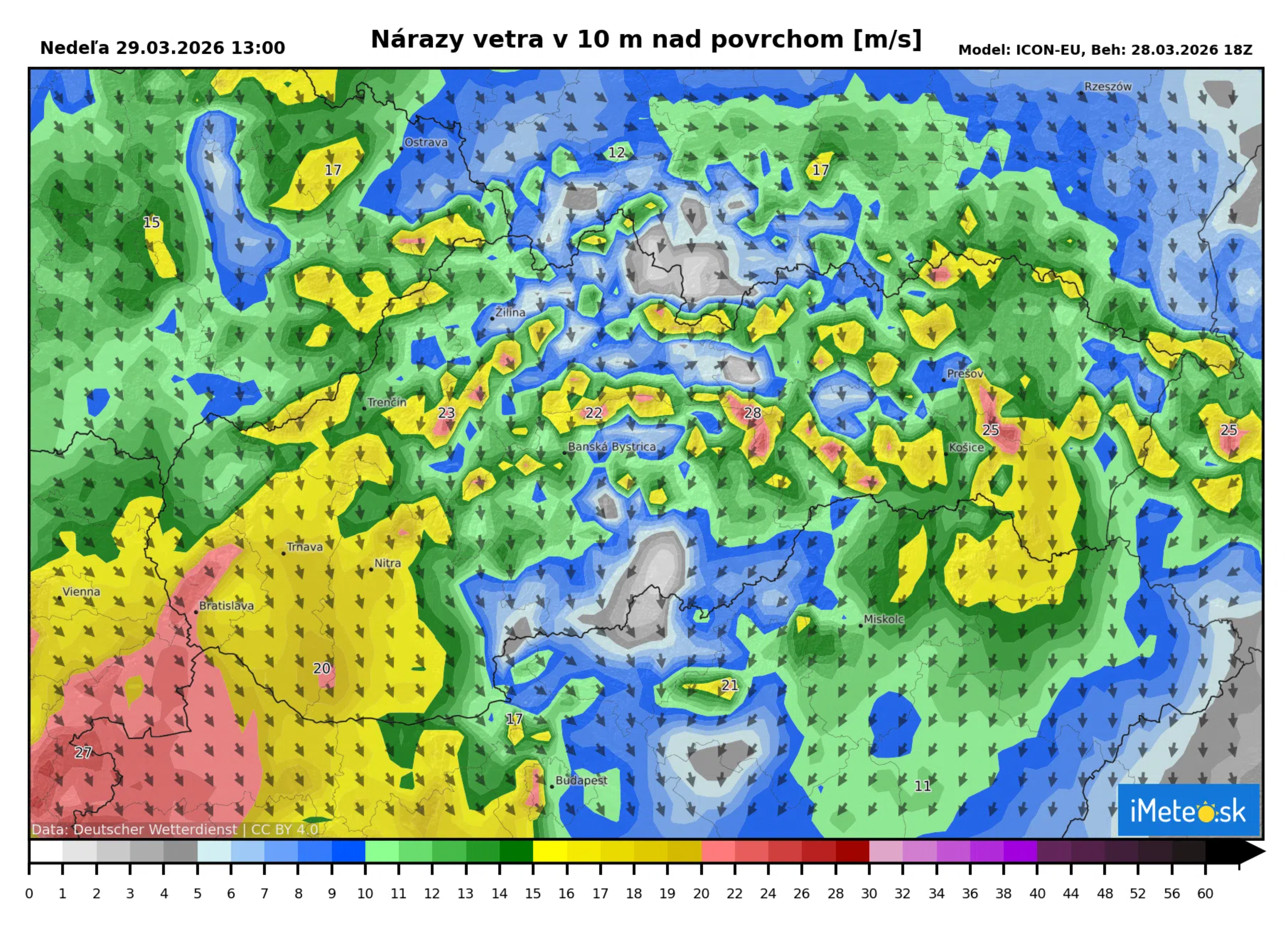 Výrazným sprievodným javom dnešného počasia bude vietor. Fúkať bude prevažne severný vietor s rýchlosťou od 3 do 9 m/s, čo zodpovedá približne 10 až 30 km/h. Na západe a na juhovýchode Slovenska sa však miestami očakáva vietor s rýchlosťou okolo 12 m/s, teda približne 45 km/h, pričom v nárazoch môže ojedinele dosahovať až 19 m/s, čo predstavuje približne 70 km/h.