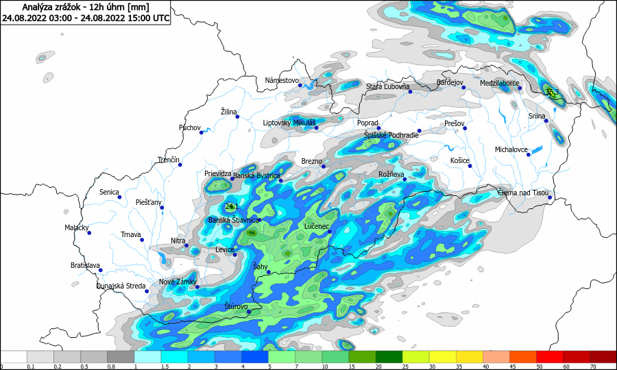 Dnešné búrky priniesli početné zrážky najmä na juh stredného Slovenska. Tam zväčša spadlo od 5 do 30 mm zrážok.