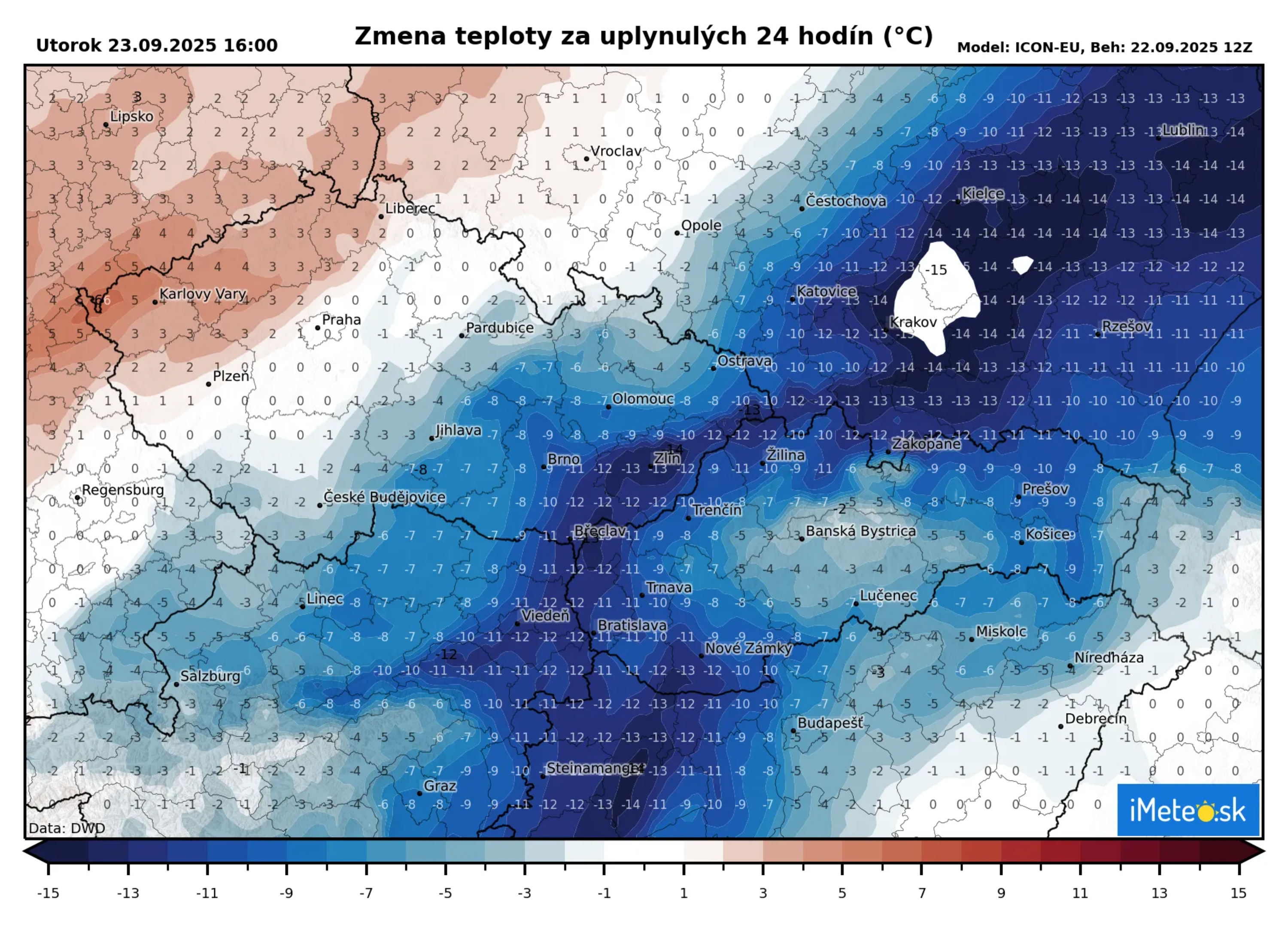 Už v priebehu dnešnej noci na naše územie začal prúdiť veľmi chladný vzduch od severozápadu, ktorý prinesie ochladenie oproti včerajším teplotám o viac ako 10 °C, ojedinele sa môže ochladiť až o 15 °C.