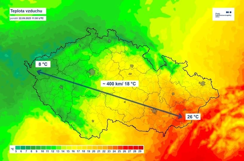 Teplotný rozdiel tak dosiahol na území cca 400 km až 18 °C, informoval Český hydrometeorologický ústav na svojich sociálnych sieťach.