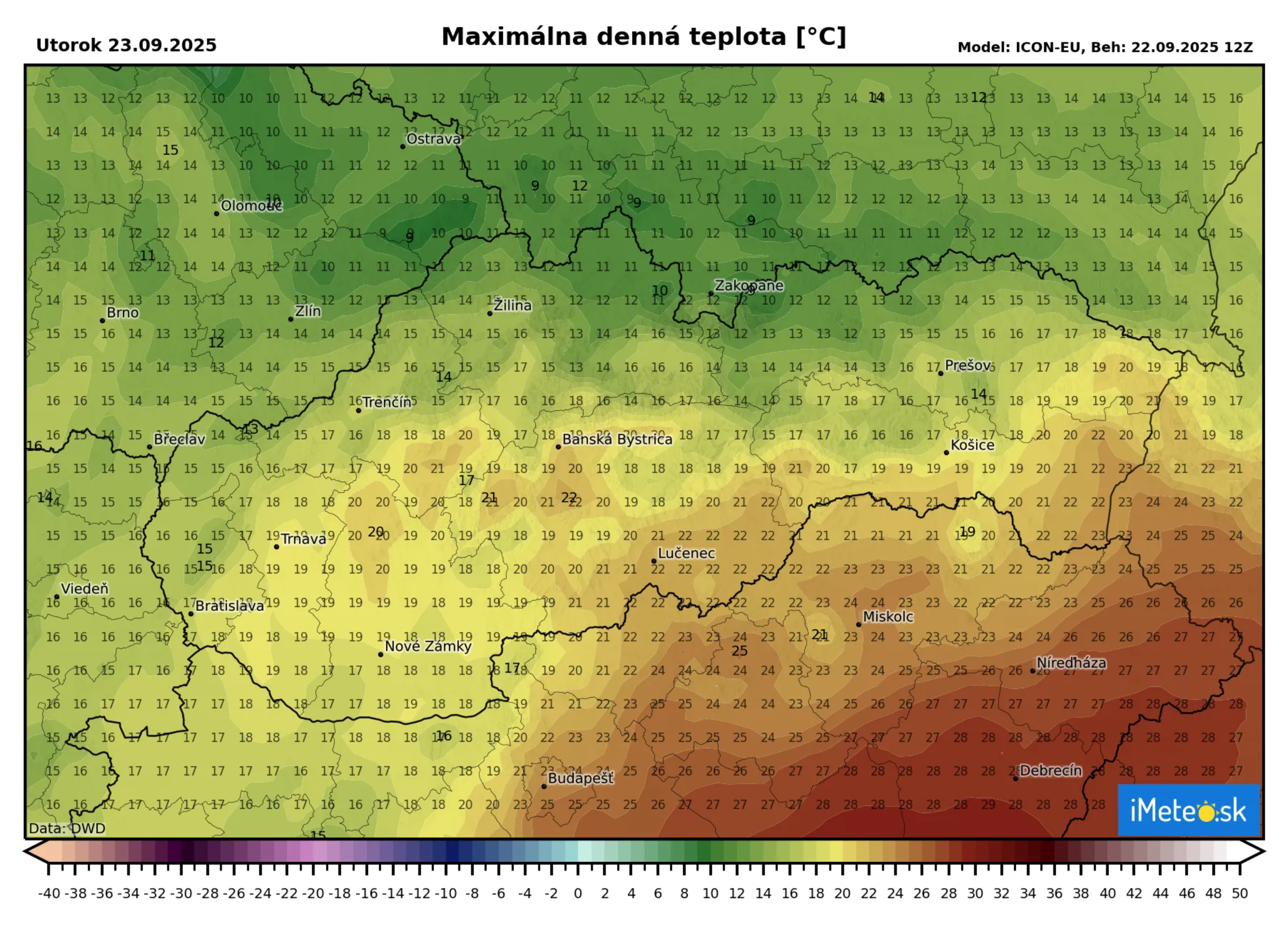 Pondelkové maximálne teploty sa dostali k +24 až +30 °C, dnešné teploty už budú výrazne nižšie. Maximálne teploty by sa mali pohybovať len od +15 do +23 °C. Na severe bude ešte chladnejšie a tepoty sa môžu pohybovať len medzi +10 až +15 °C.
