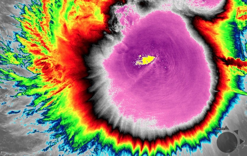 Na takto extrémnu teplotu nie sú prispôsobené ani farebné škály, ktoré zvýrazňujú teplotu. Na obrázku môžeme extrémne teploty pozorovať ako žltú škvrnu západne od stredu tajfúnu.