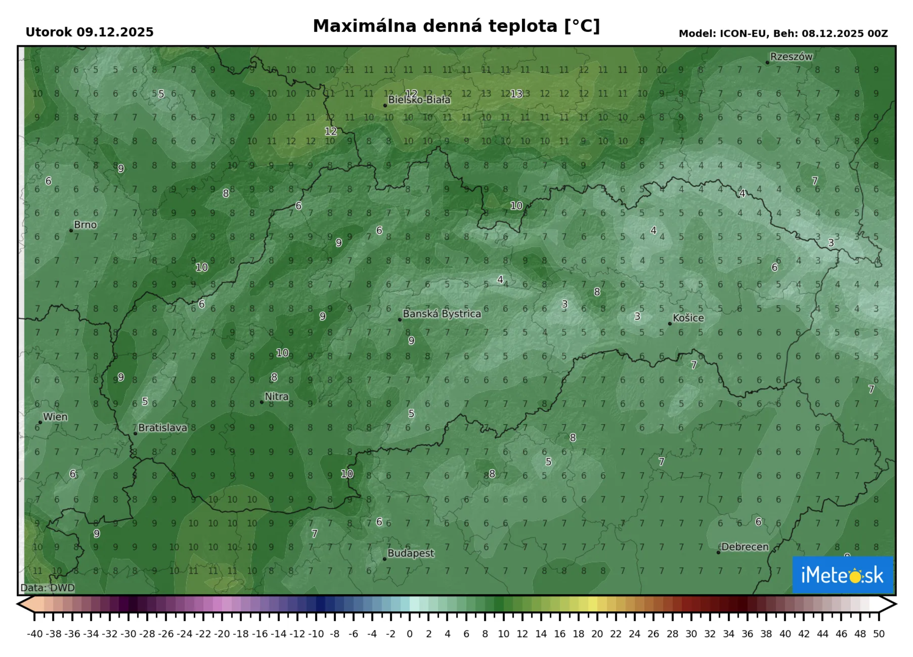 Teplý front prinesie nadpriemerne vysoké teploty – na mnohých miestach Slovenska sa denné maximá môžu vyšplhať až k +11 °C, miestami dokonca vyššie.