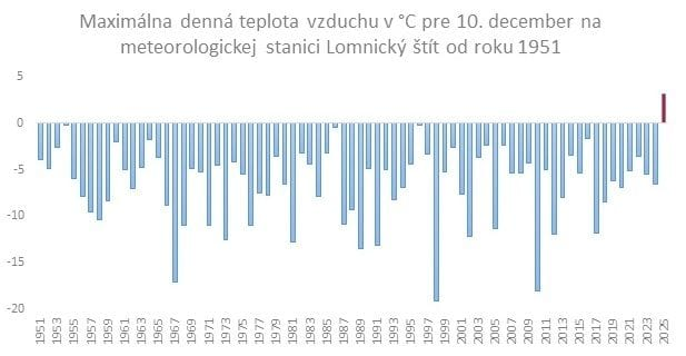 „Ak hodnotíme údaje od roku 1951, napríklad na Lomnickom štíte, kde v stredu (10.12.2025) dosiahla teplota vzduchu až +3,2 °C, a pôvodný 71 rokov starý rekord maximálnej dennej teploty vzduchu pre 10. december bol -0,2 °C, z roku 1954, a táto hodnota ho prekonala o viac ako 3 °C,“ informuje SHMÚ.