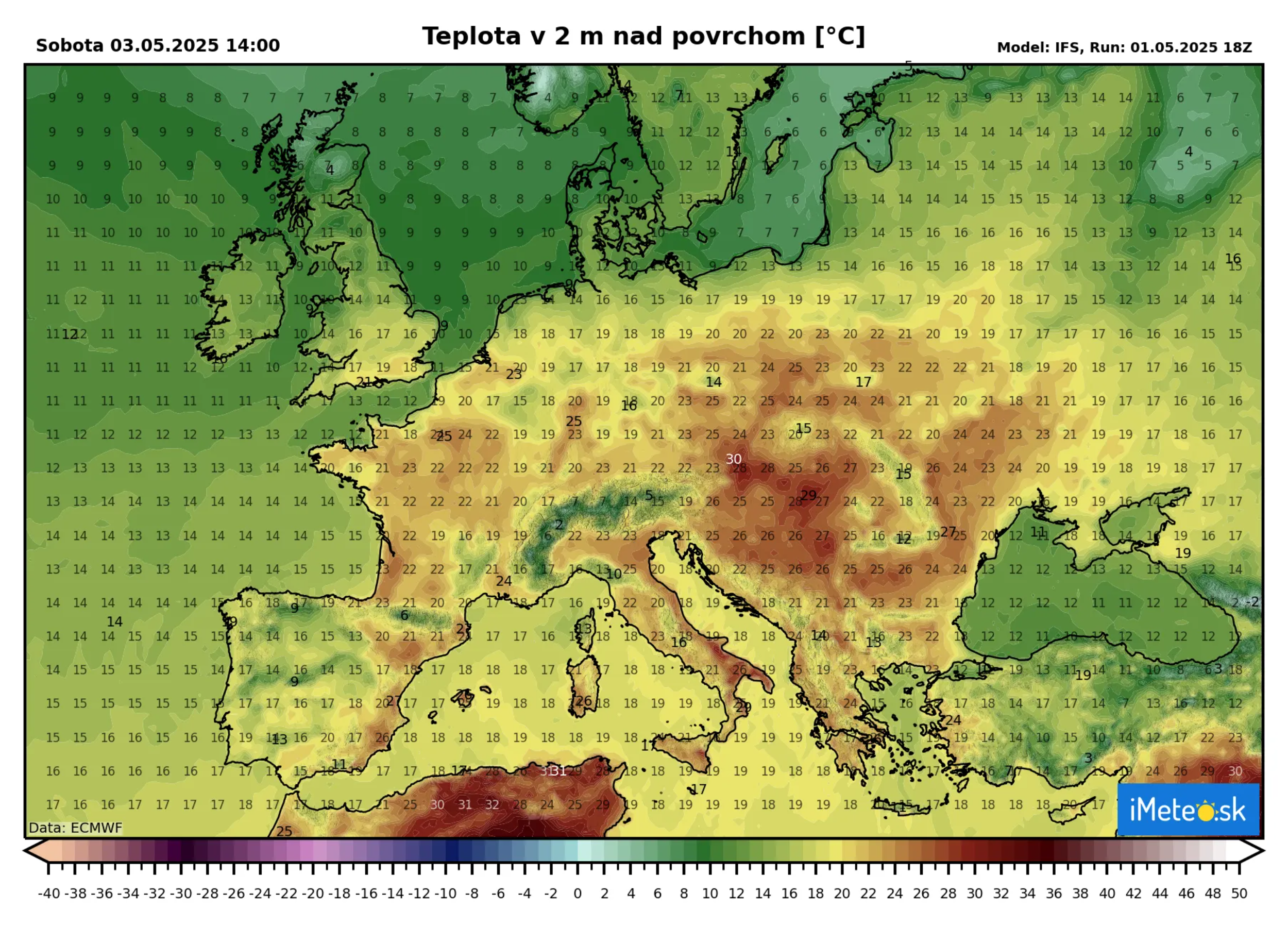 Tlaková výš sa posúva nad našu oblasť a u nás sa dnes rovnako očakávajú veľmi vysoké teploty, avšak ešte teplejšie bude v sobotu, kedy by sme mohli na juhu Slovenska zaznamenať prvýkrát v tomto roku tropickú teplotu +30 °C.