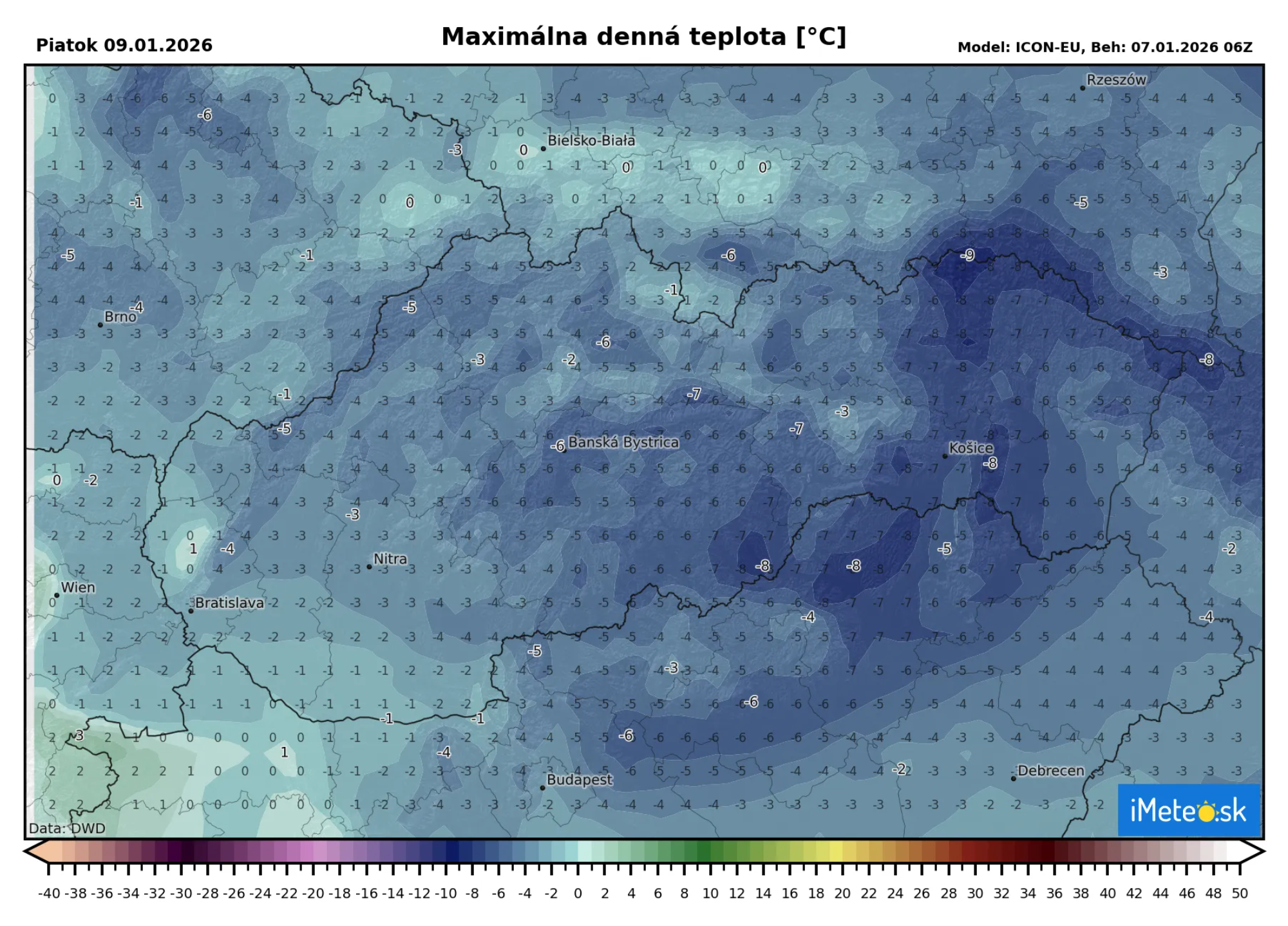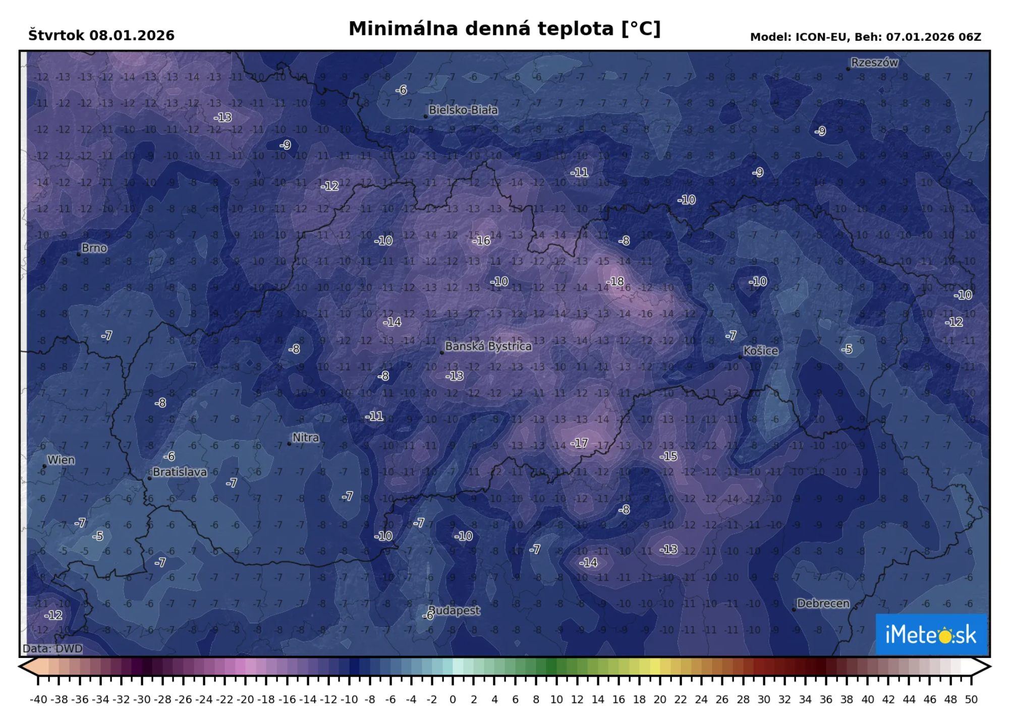 Teploty by mali dokonca aj v Bratislave klesať ku -10 °C. Do piatkového rána poklesnú teploty na -7 až -15 °C, ale ako vidieť aj na mape, tak miestami teploty aj na strednom Slovensku v nižších polohách poklesnú na -15 až -22 °C. V najmrazivejších lokalitách celkom určite poklesnú teploty pod -25 °C a atakovať budú až -30 °C.