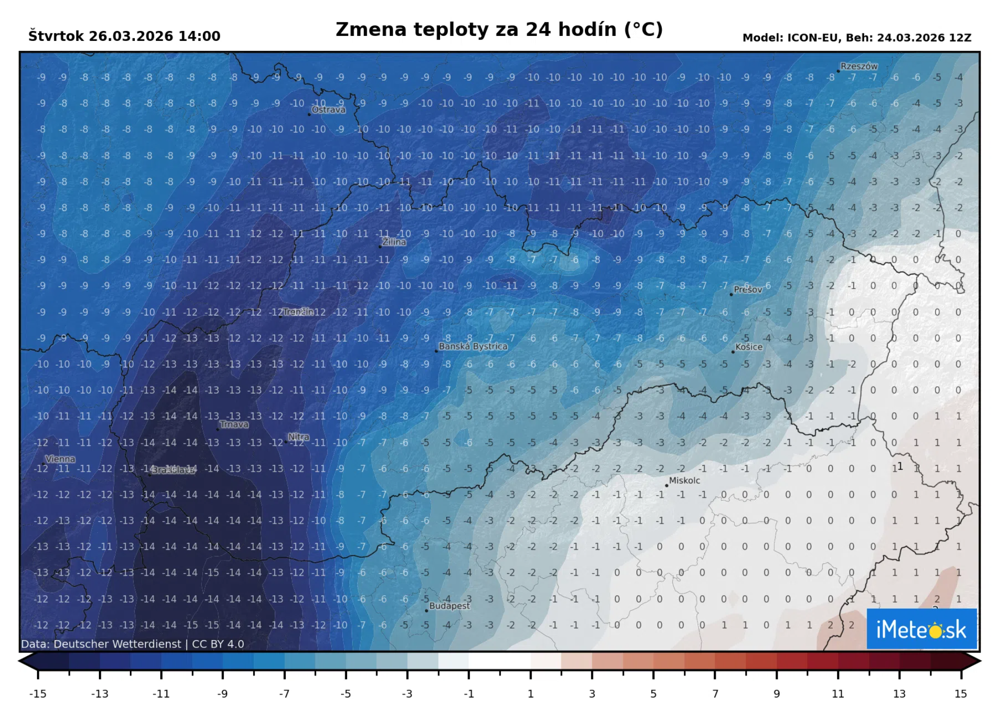 Veľmi dobre to ilustruje porovnanie zajtrajšej poludňajšej teploty s tou dnešnou. Ako vidieť na mape teplotných rozdielov, zajtrajšie teploty budú na západe a severe aj o 15 °C nižšie ako dnes.
