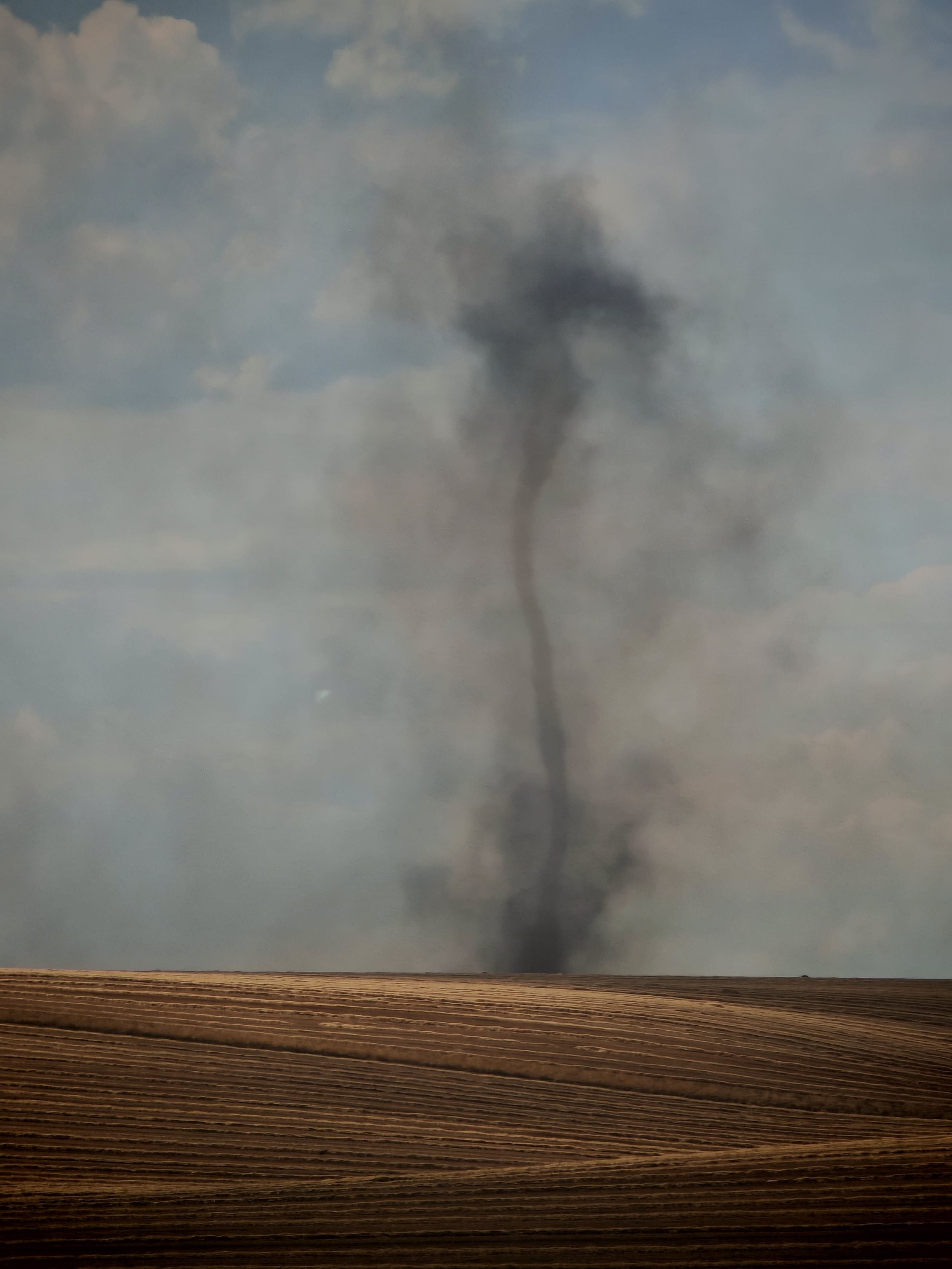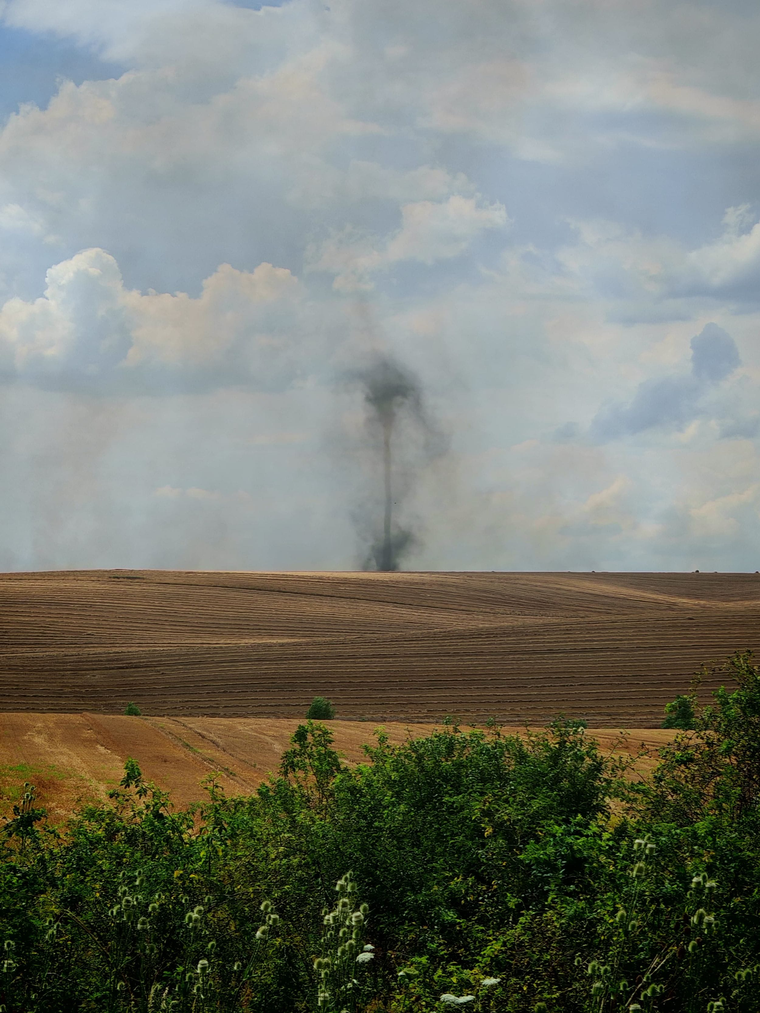 Podľa záberov z miesta udalosti sa nad poľom, kde horel materiál (pravdepodobne suchá vegetácia), vytvoril úzky a súvislý stĺpec rotujúceho dymu a prachu, ktorý siahal desiatky metrov do výšky.