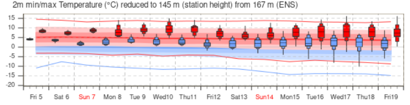 Všimnite si, že rozptyl očakávanej teploty sa s pribúdajúcimi dňami zväčšuje, no stále sa teplota udržuje nad úrovňou dlhodobého normálu.