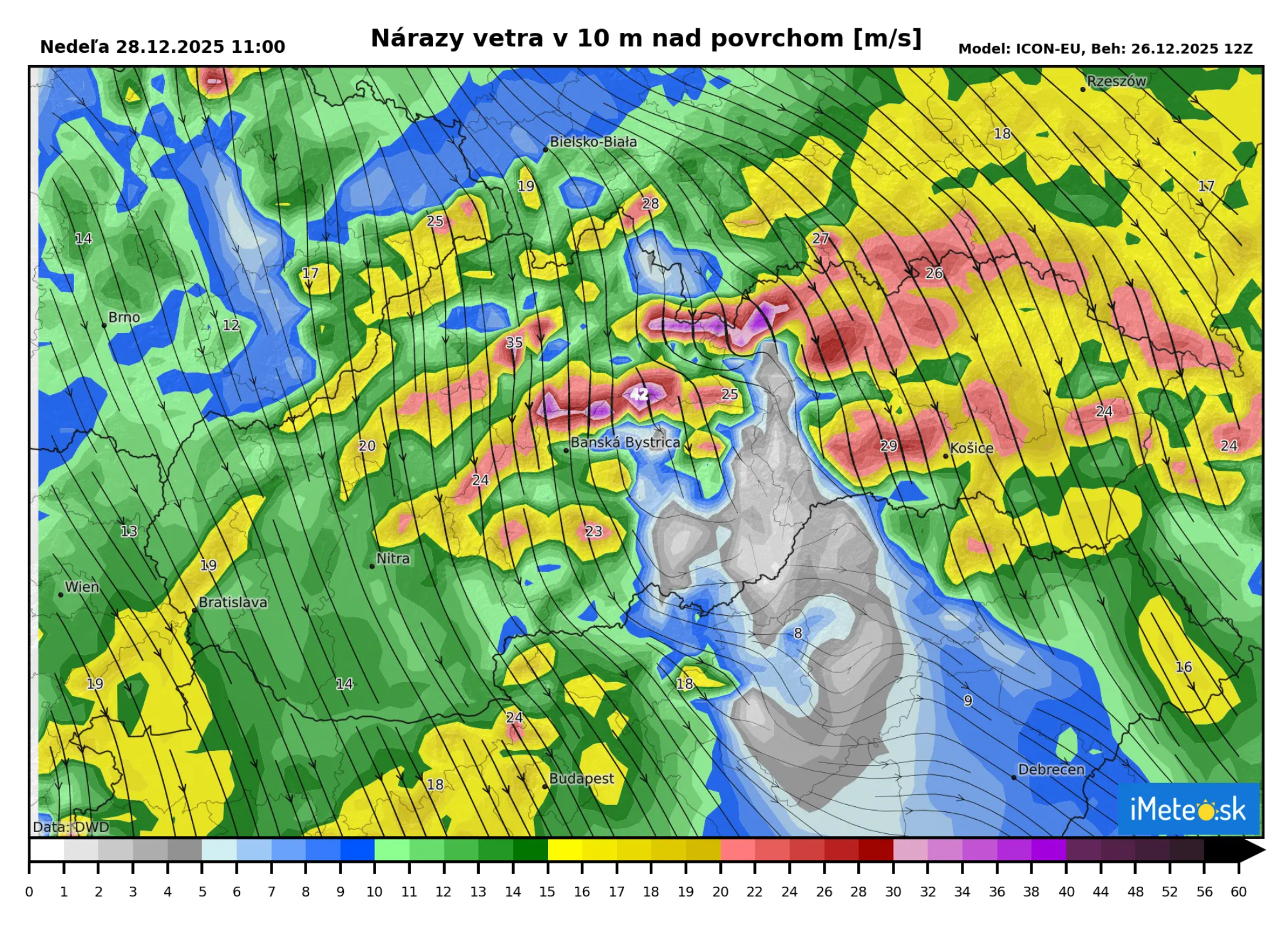 Veľmi veterné počasie však čaká prakticky celé Slovensko s výnimkou nížin Banskobystrického kraja. Vietor bude dosahovať nárazy od 15 do 20 m/s. Najsilnejší vietor bude v nižších polohách na východe s nárazmi do 25 m/s.