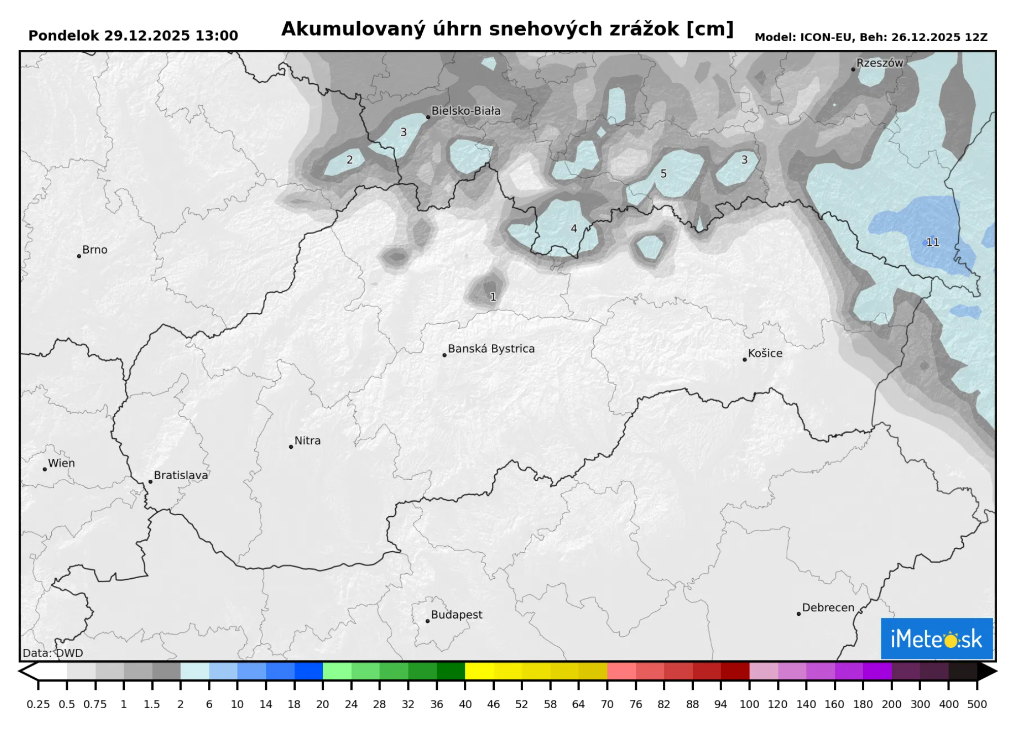 Ako však vidieť na mape, snehové zrážky by mali byť sústredené len do krajných, severných okresov, no netreba zúfať. Výraznejšie zrážky ešte len prídu ku koncu roka.